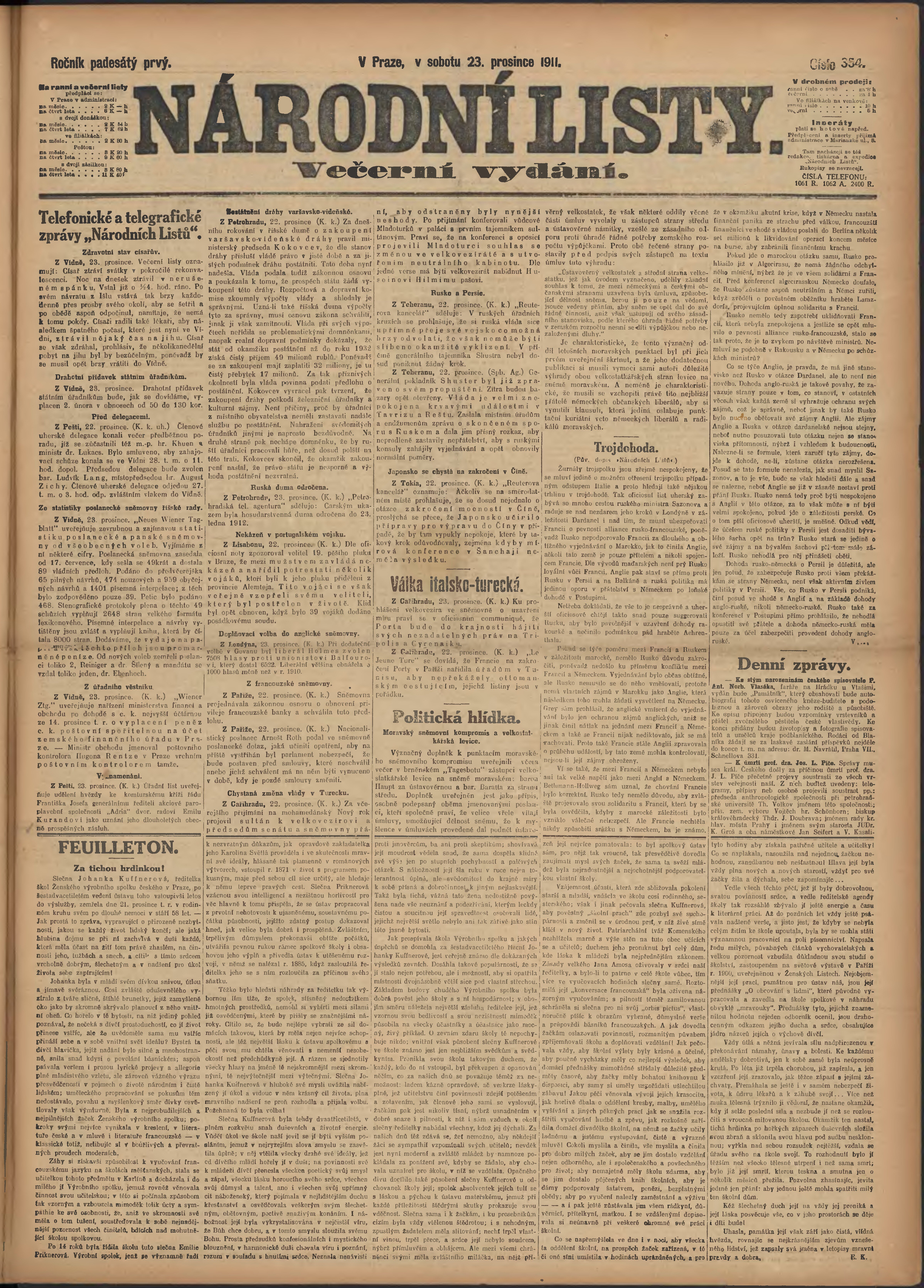 * Datum vydání výtisku: 23.12.1911 Číslo výtisku: 354 Poznámky k výtisku: večerní vydání;