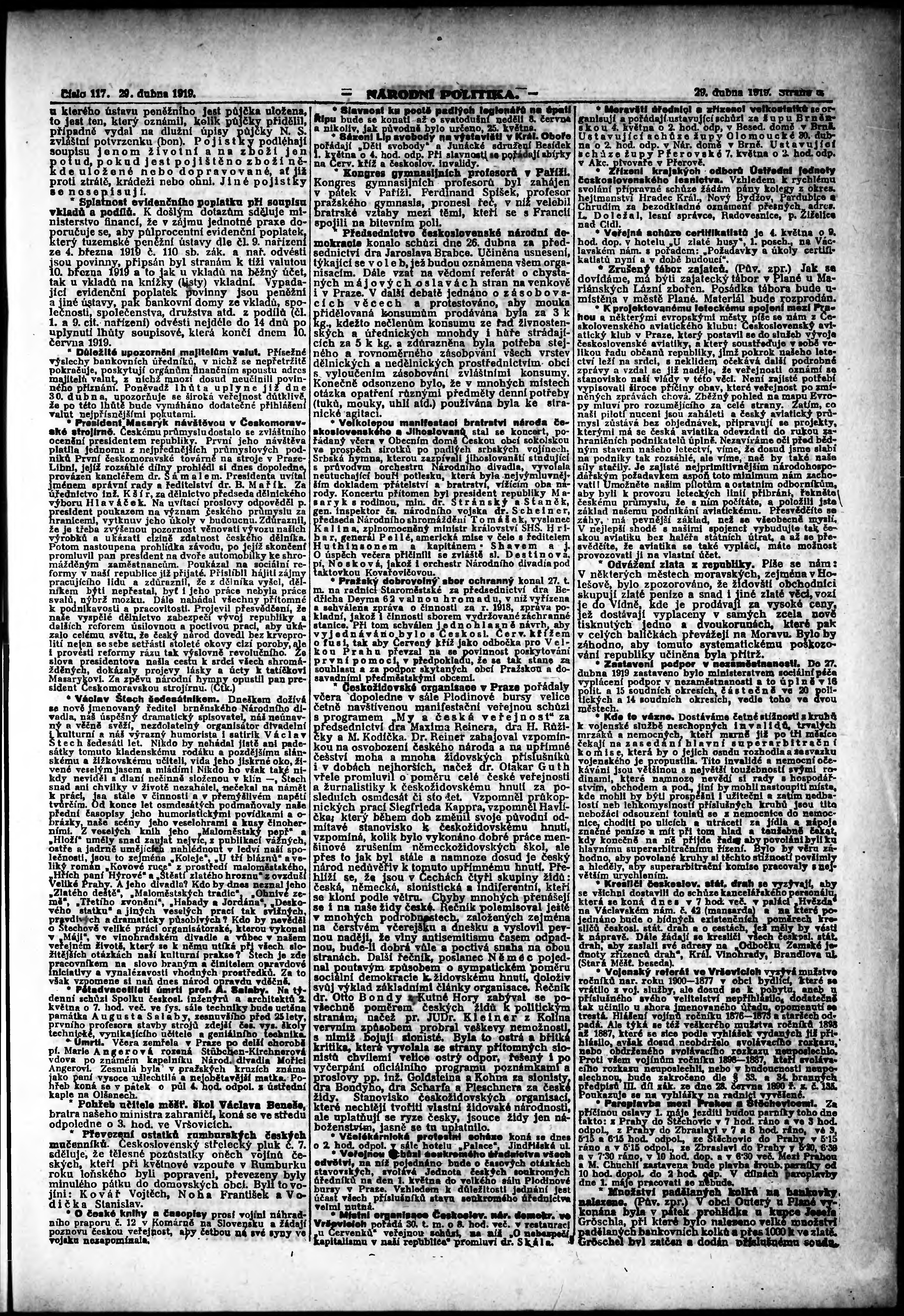 * Datum vydání výtisku: 29.4.1919 Číslo výtisku: 117 Poznámky k výtisku: ranní vydání; vydání pro Prahu;