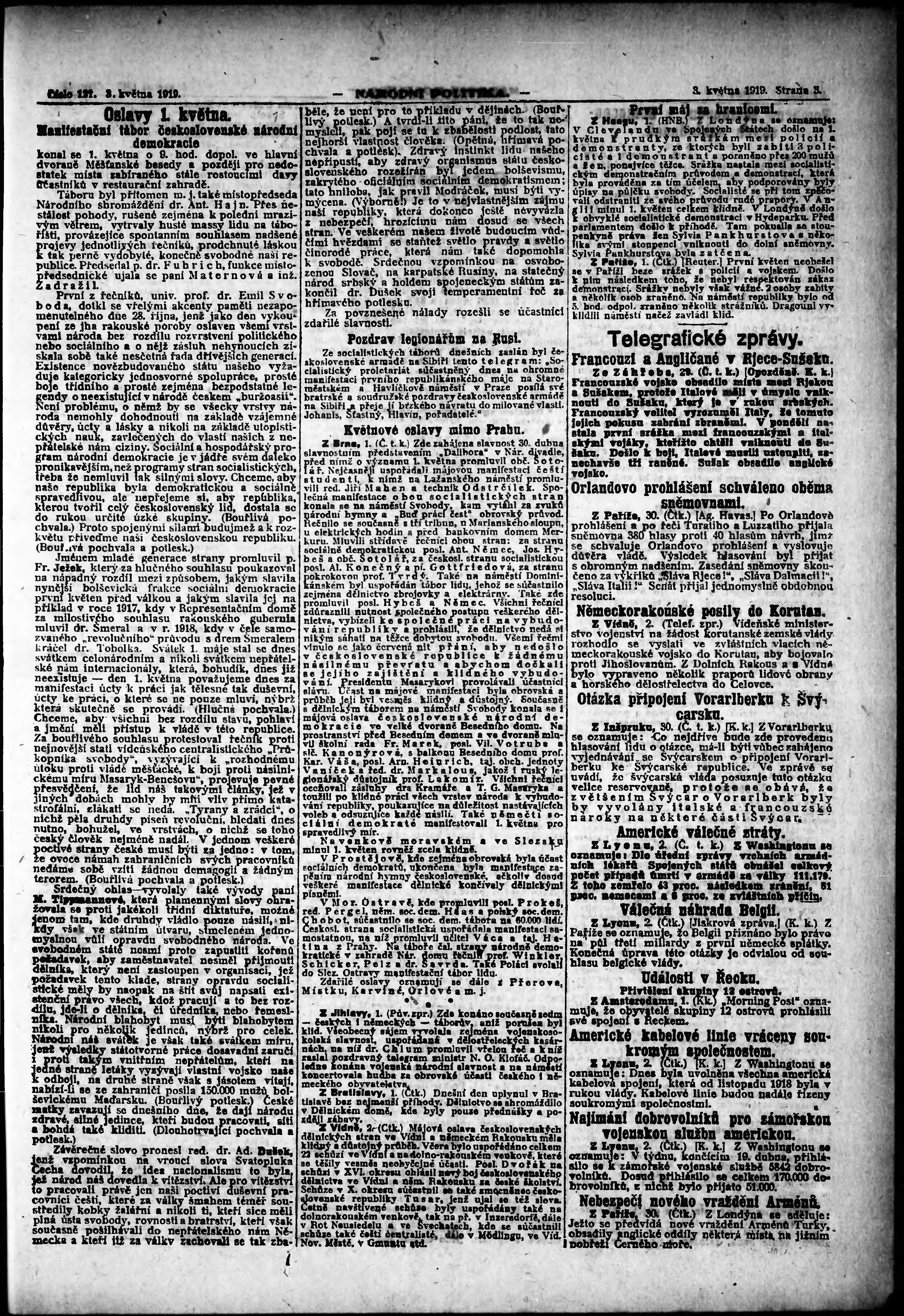 * Datum vydání výtisku: 3.5.1919 Číslo výtisku: 121 Poznámky k výtisku: ranní vydání; vydání pro Prahu;
