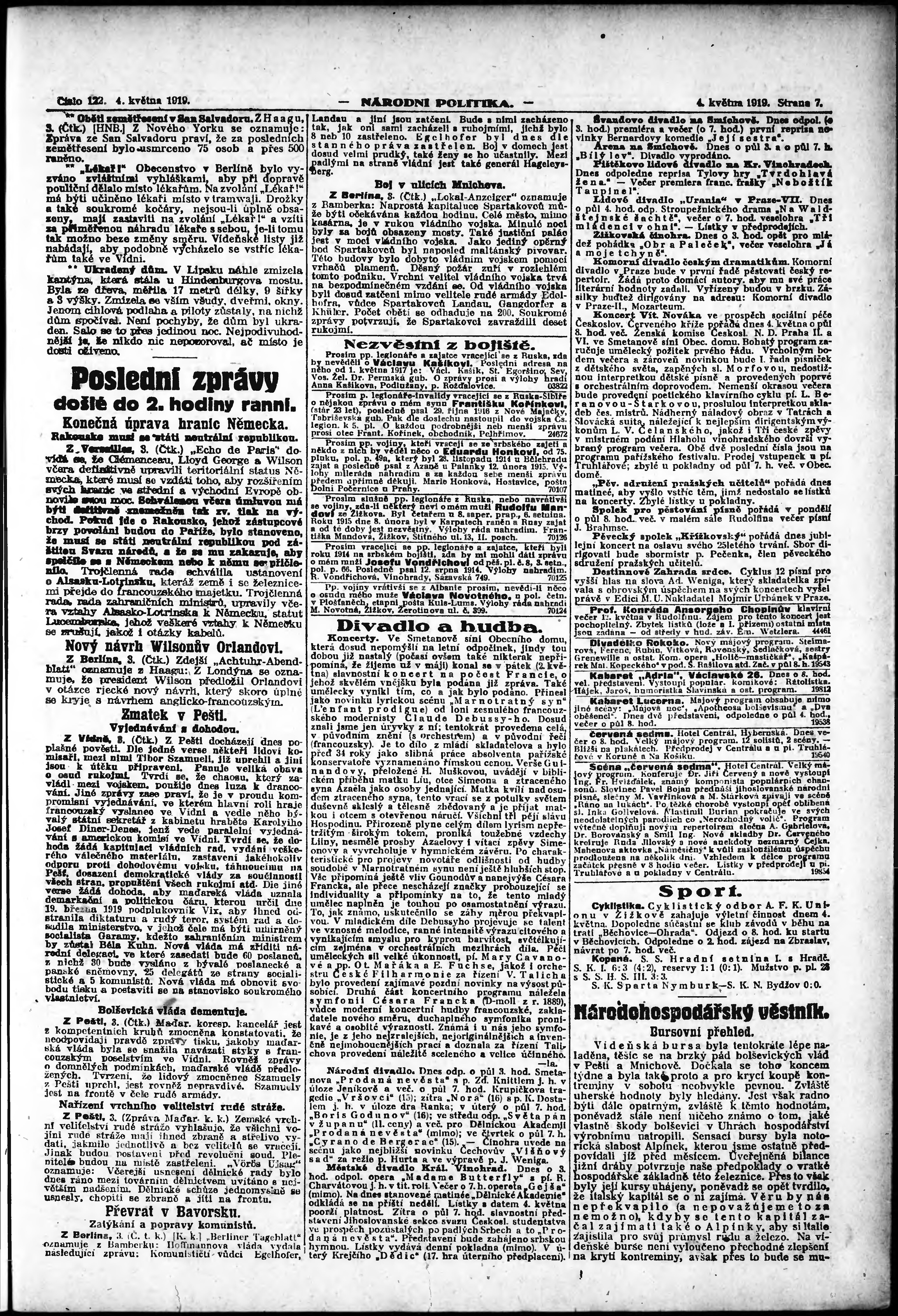 * Datum vydání výtisku: 4.5.1919 Číslo výtisku: 122 Poznámky k výtisku: ranní vydání;