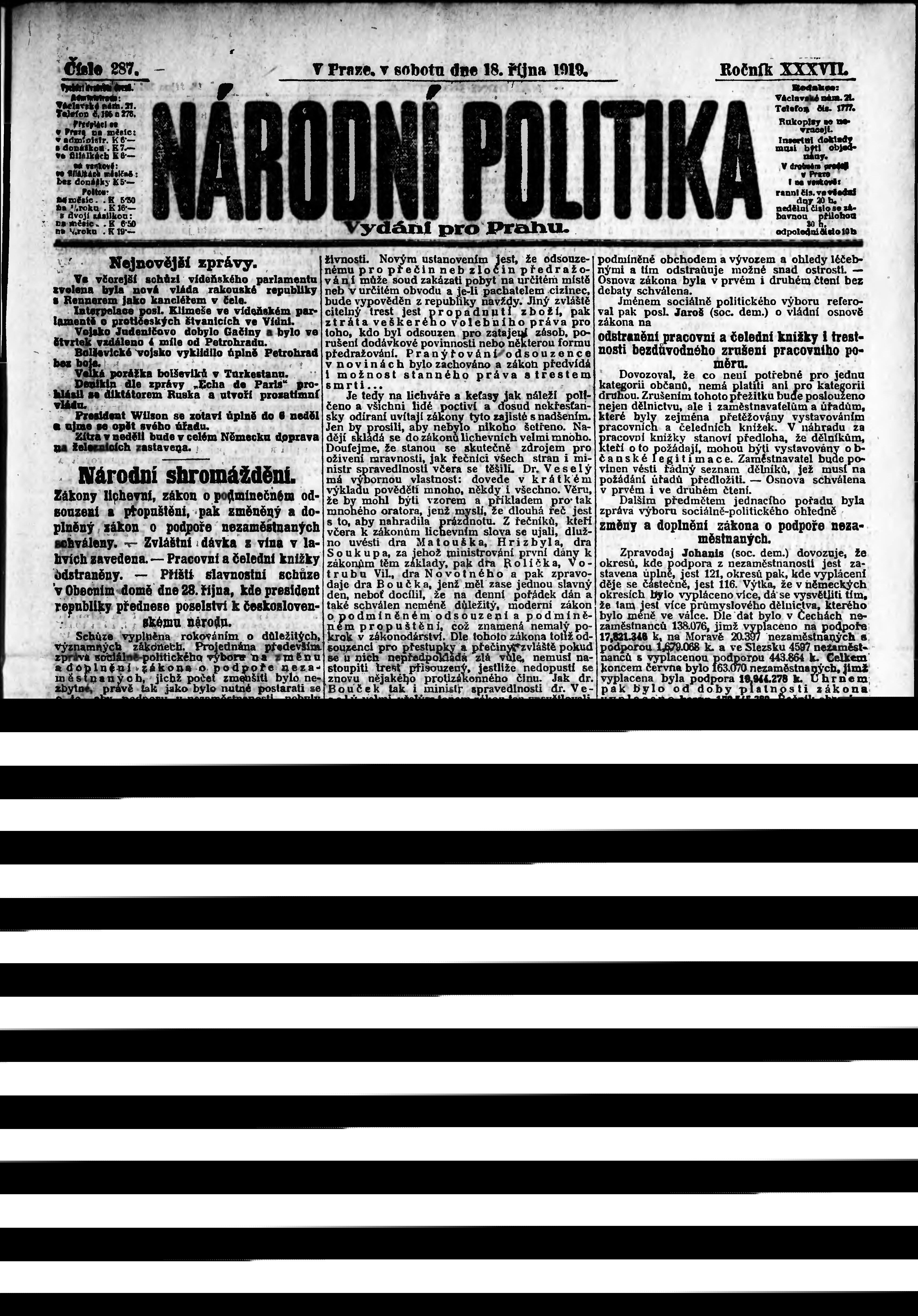 * Datum vydání výtisku: 18.10.1919 Číslo výtisku: 287 Poznámky k výtisku: ranní vydání; vydání pro Prahu;