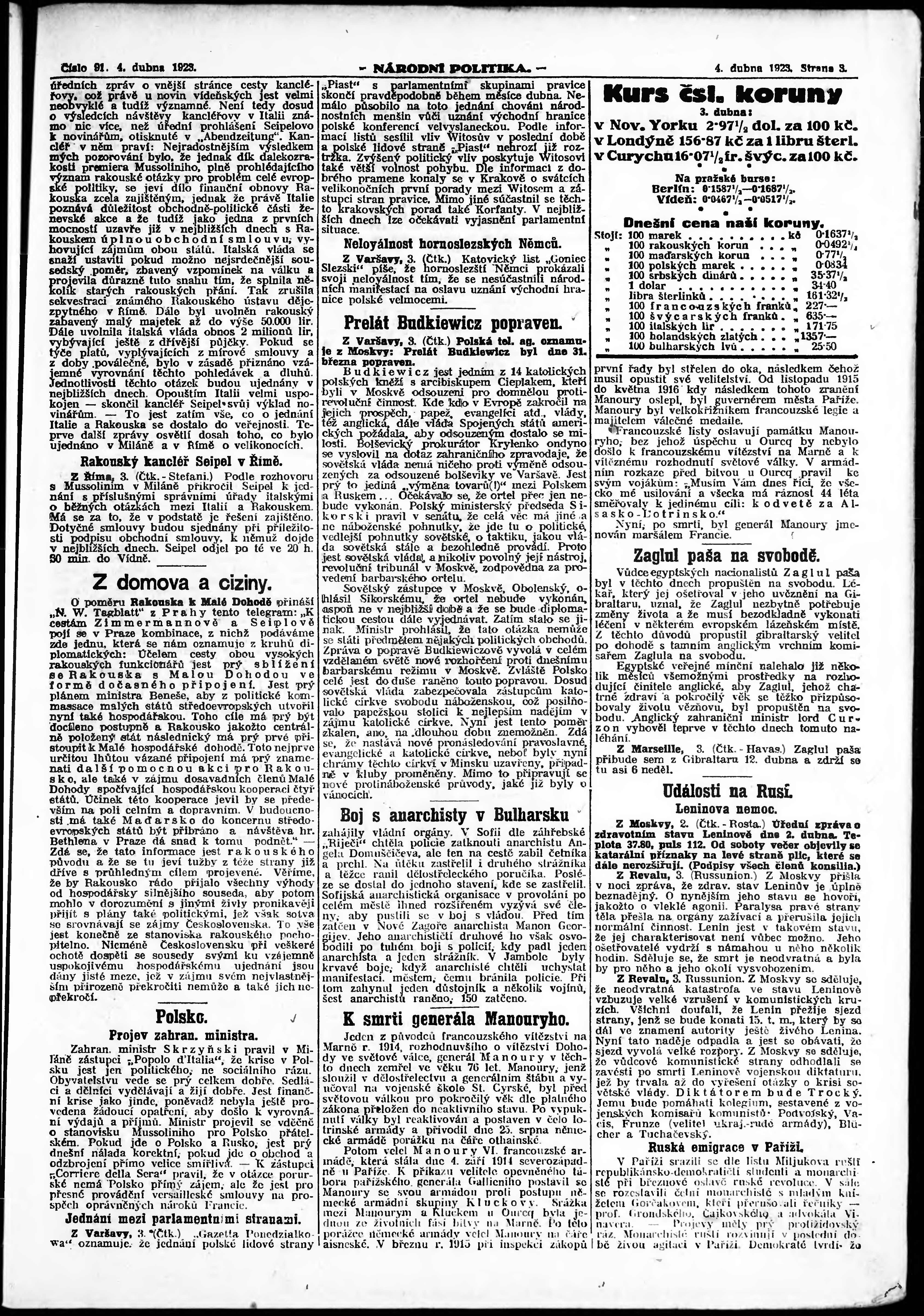 * Datum vydání výtisku: 4.4.1923 Číslo výtisku: 91 Poznámky k výtisku: ranní vydání; vydání pro Prahu;