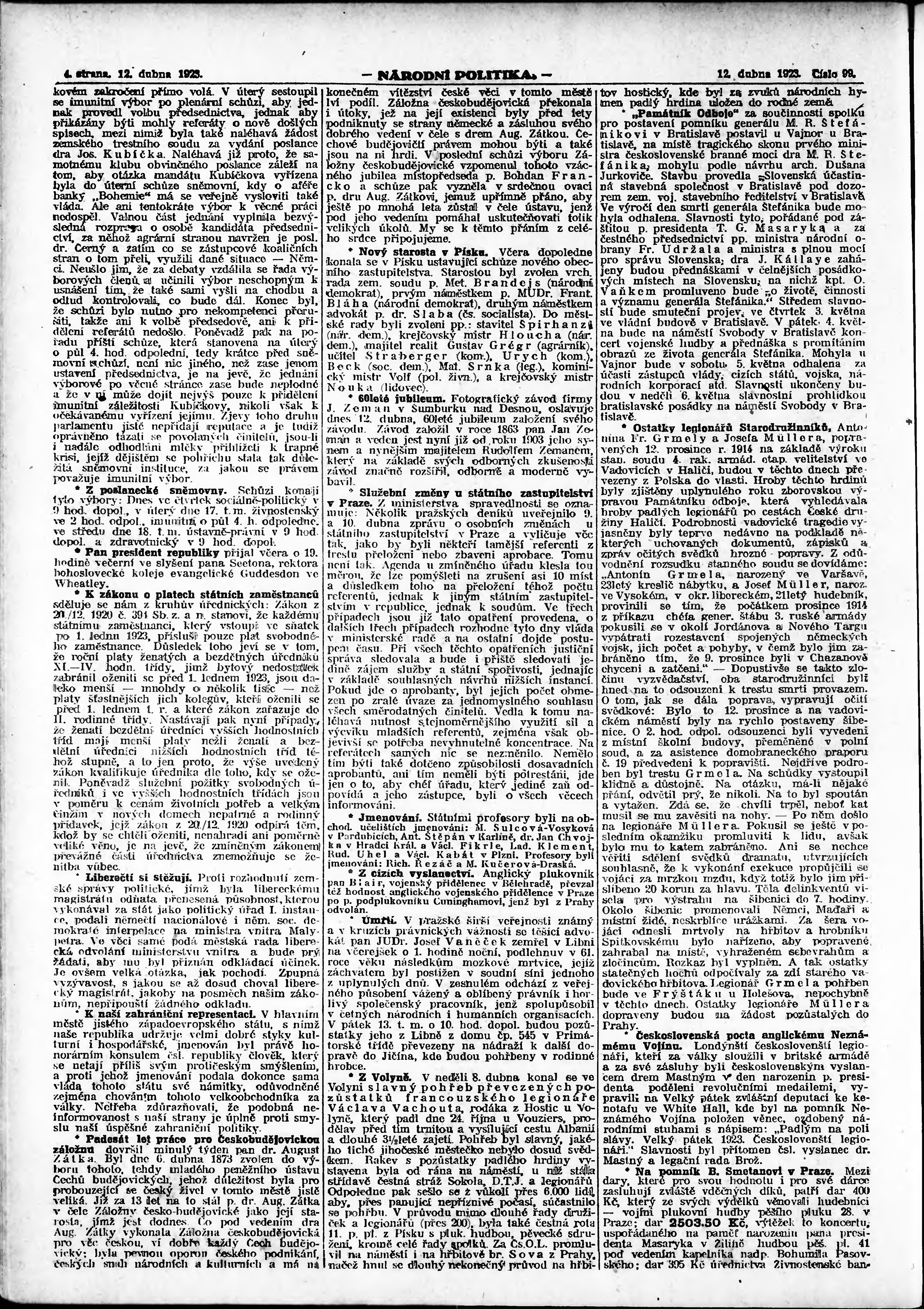 * Datum vydání výtisku: 12.4.1923 Číslo výtisku: 99 Poznámky k výtisku: ranní vydání; vydání pro Prahu;
