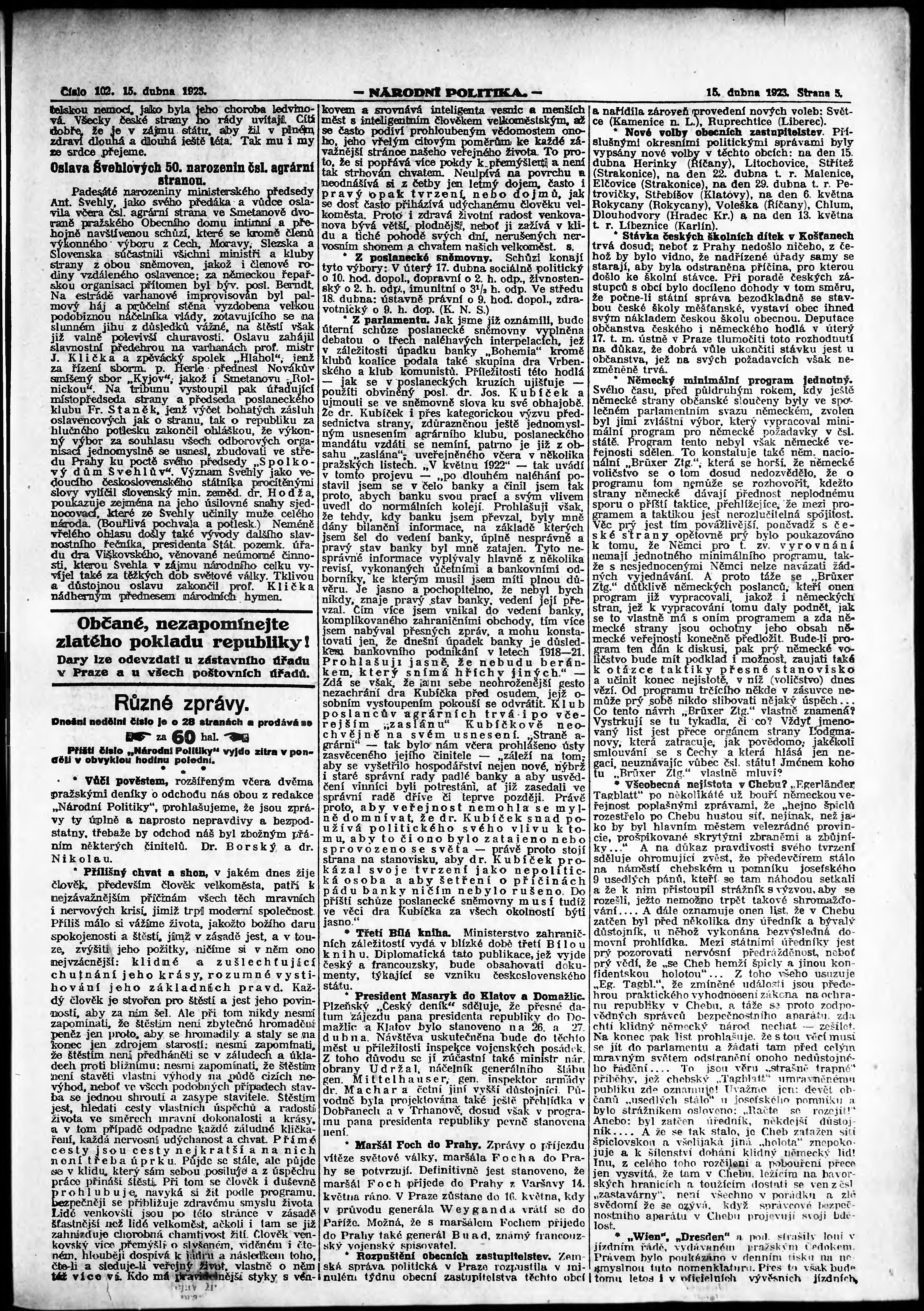 * Datum vydání výtisku: 15.4.1923 Číslo výtisku: 102 Poznámky k výtisku: ranní vydání;