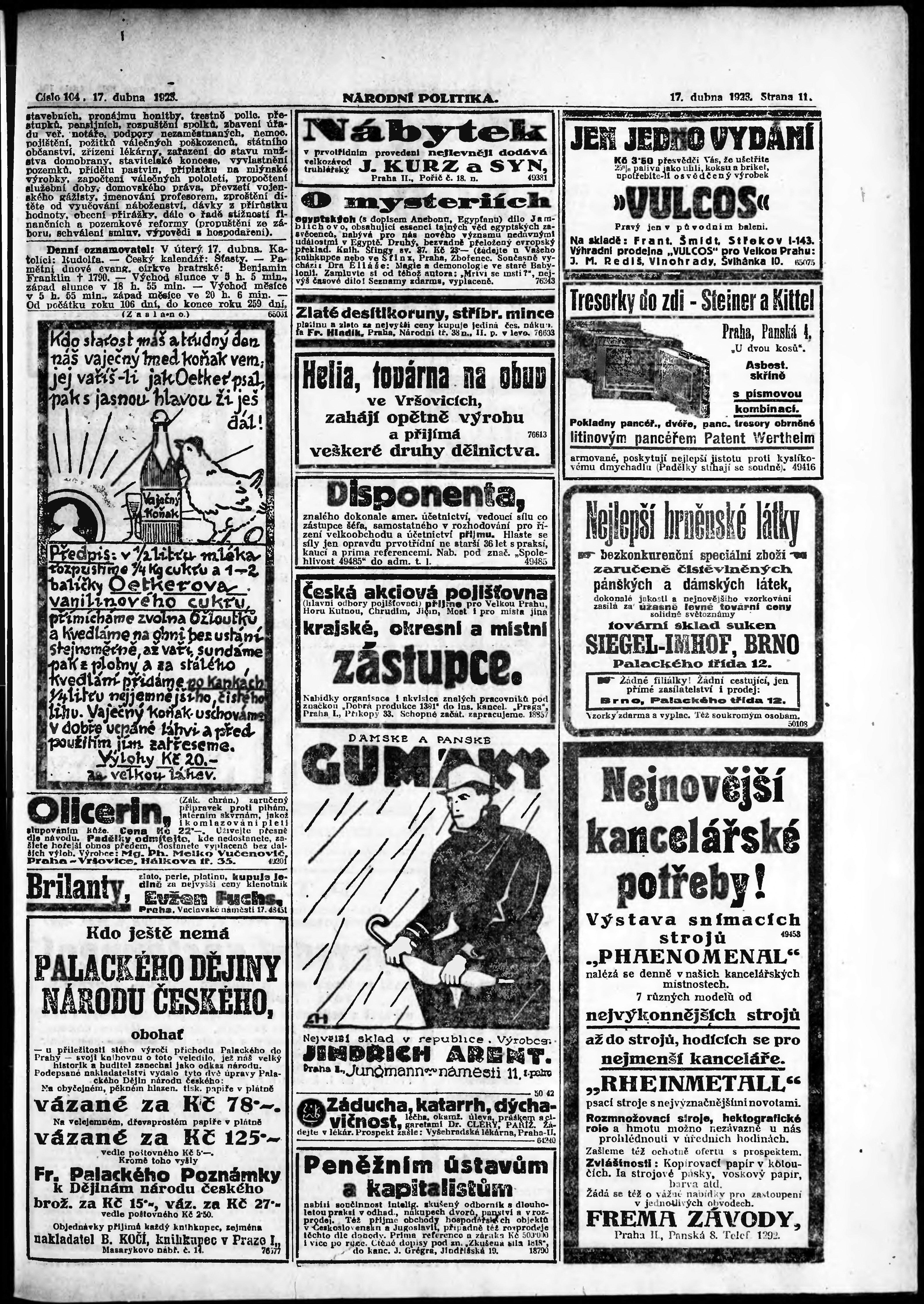 * Datum vydání výtisku: 17.4.1923 Číslo výtisku: 104 Poznámky k výtisku: ranní vydání; vydání pro Prahu;