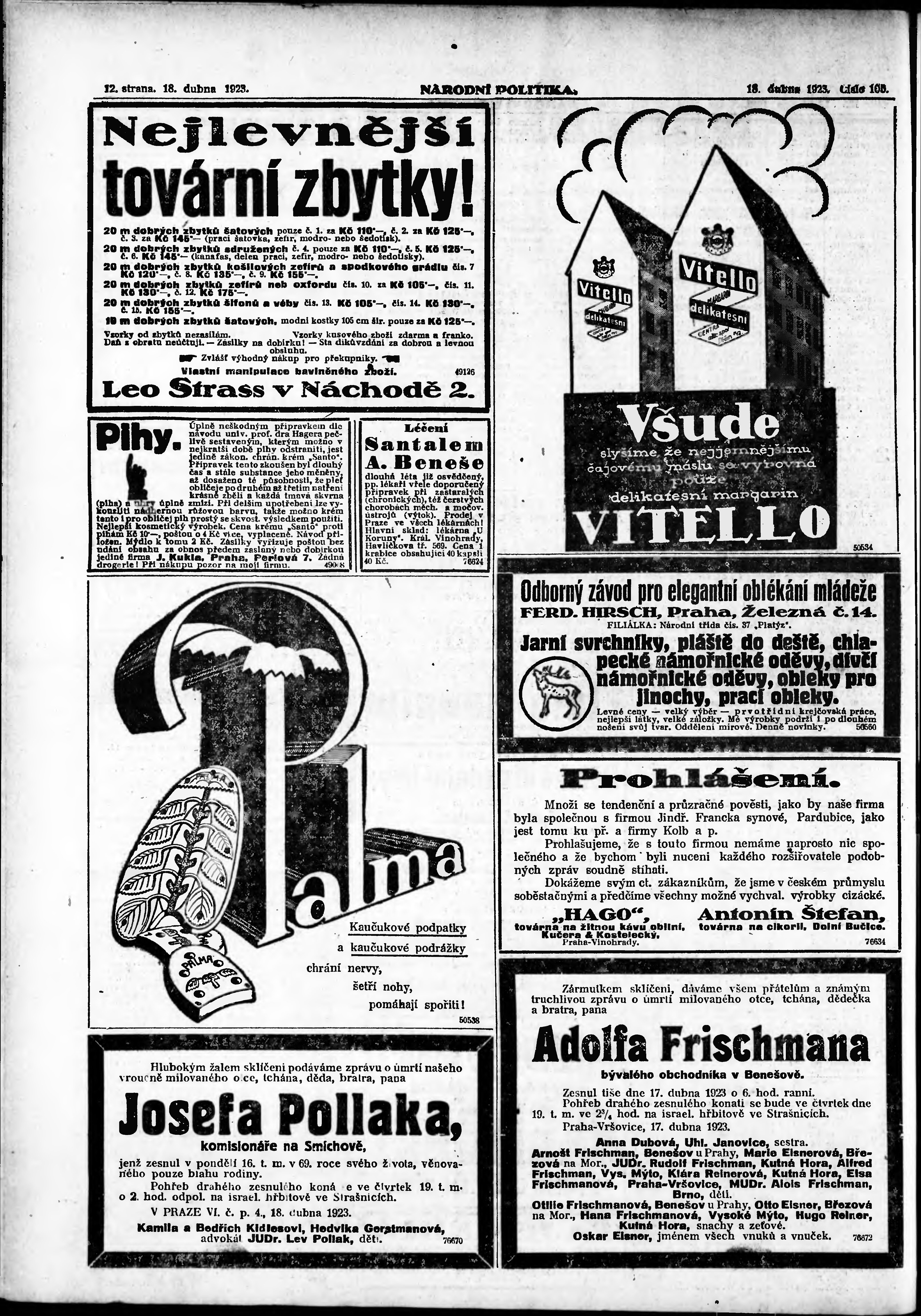 * Datum vydání výtisku: 18.4.1923 Číslo výtisku: 105 Poznámky k výtisku: ranní vydání; vydání pro Prahu;