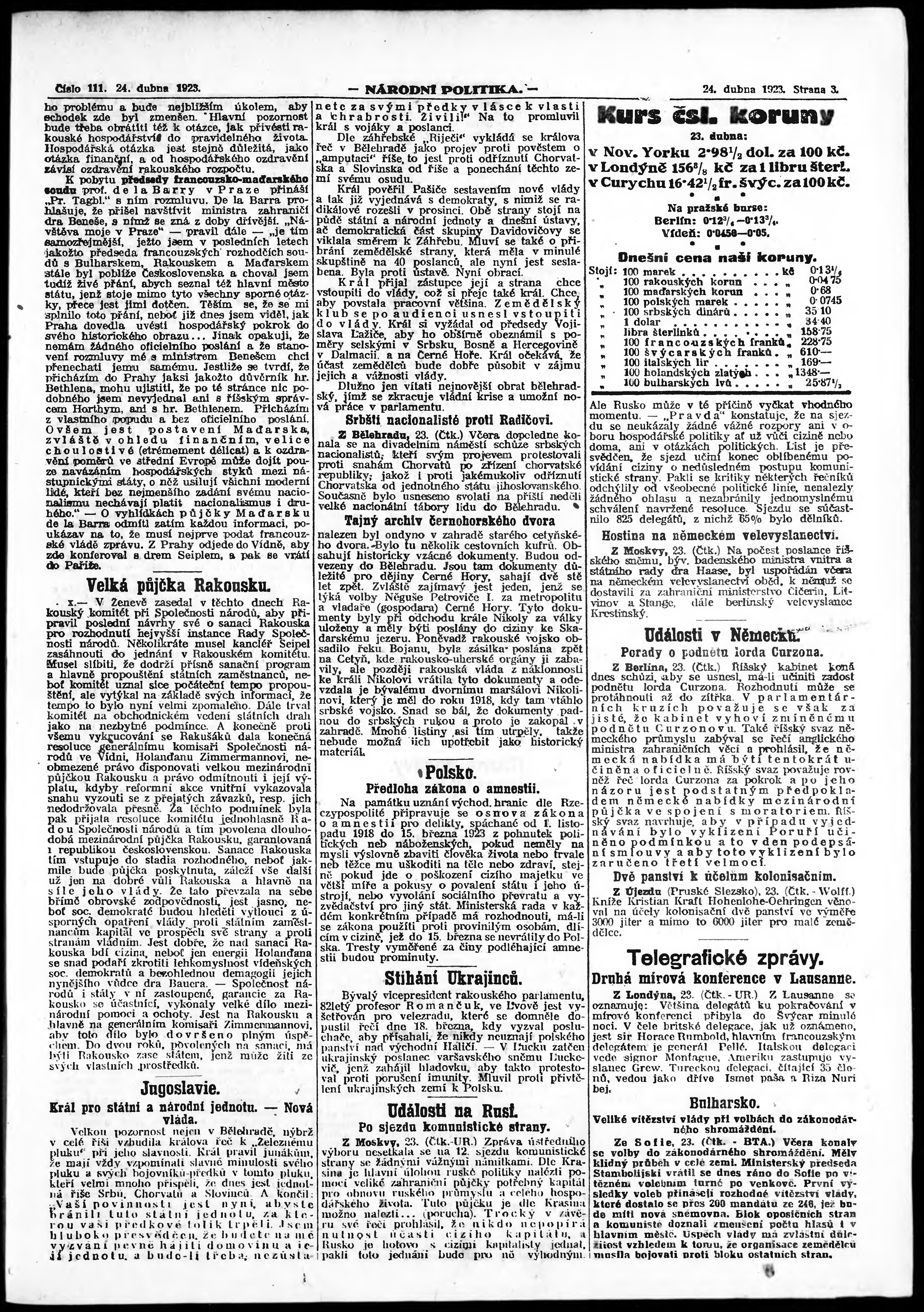 * Datum vydání výtisku: 24.4.1923 Číslo výtisku: 111 Poznámky k výtisku: ranní vydání; vydání pro Prahu;