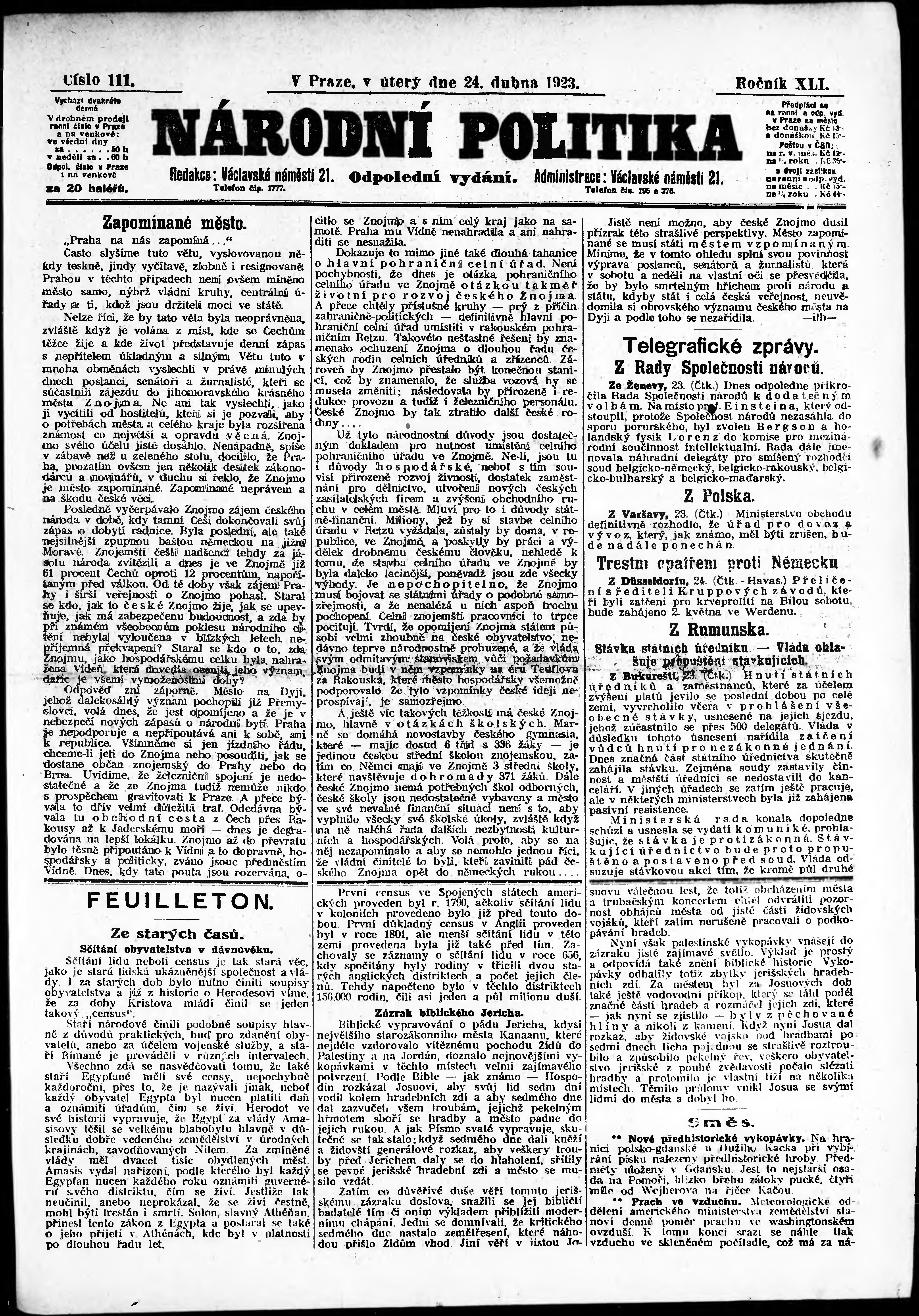 * Datum vydání výtisku: 24.4.1923 Číslo výtisku: 111 Poznámky k výtisku: odpolední vydání; s. [5] - [6] není k dispozici;