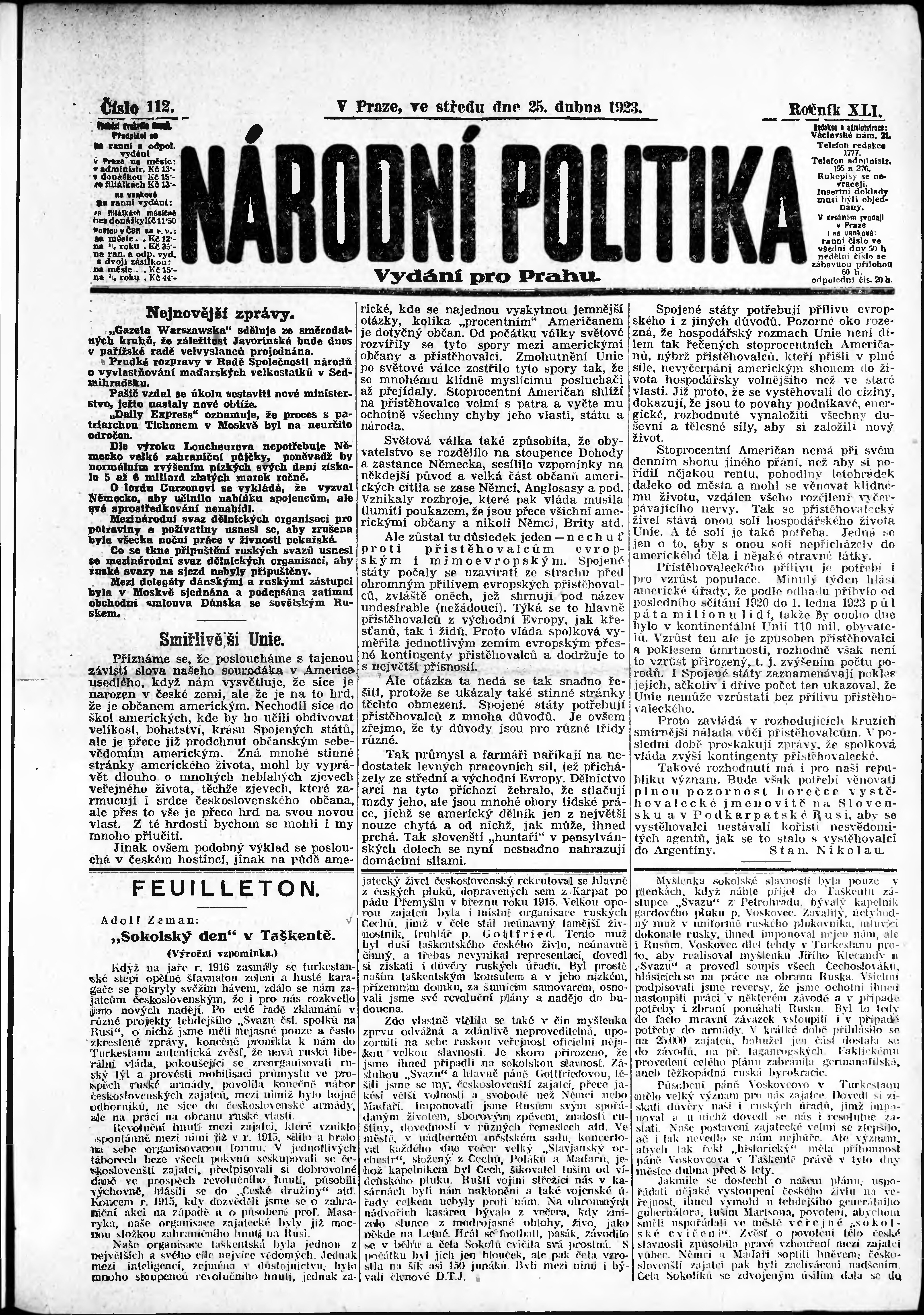 * Datum vydání výtisku: 25.4.1923 Číslo výtisku: 112 Poznámky k výtisku: ranní vydání; vydání pro Prahu;