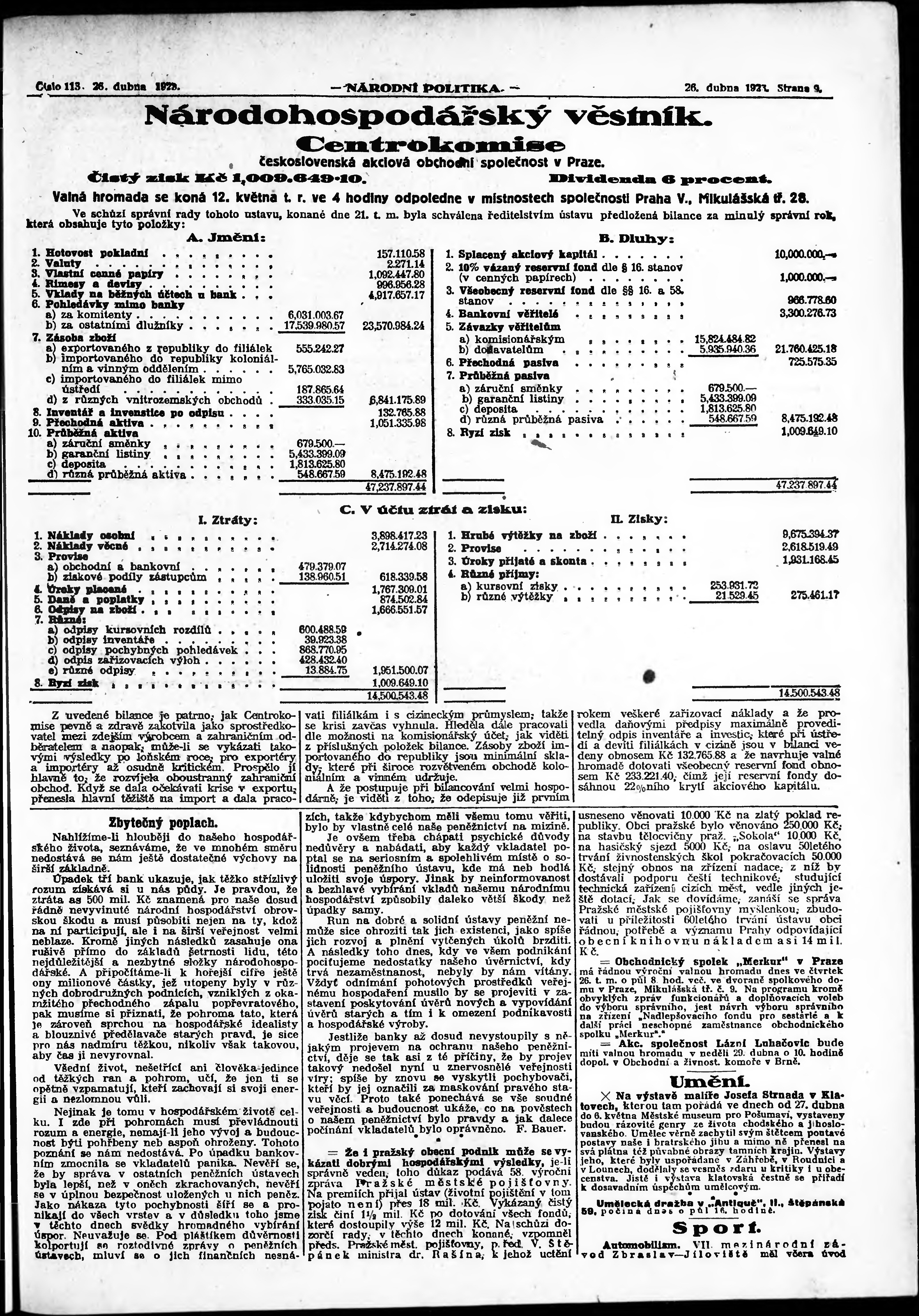 * Datum vydání výtisku: 26.4.1923 Číslo výtisku: 113 Poznámky k výtisku: ranní vydání; vydání pro Prahu;