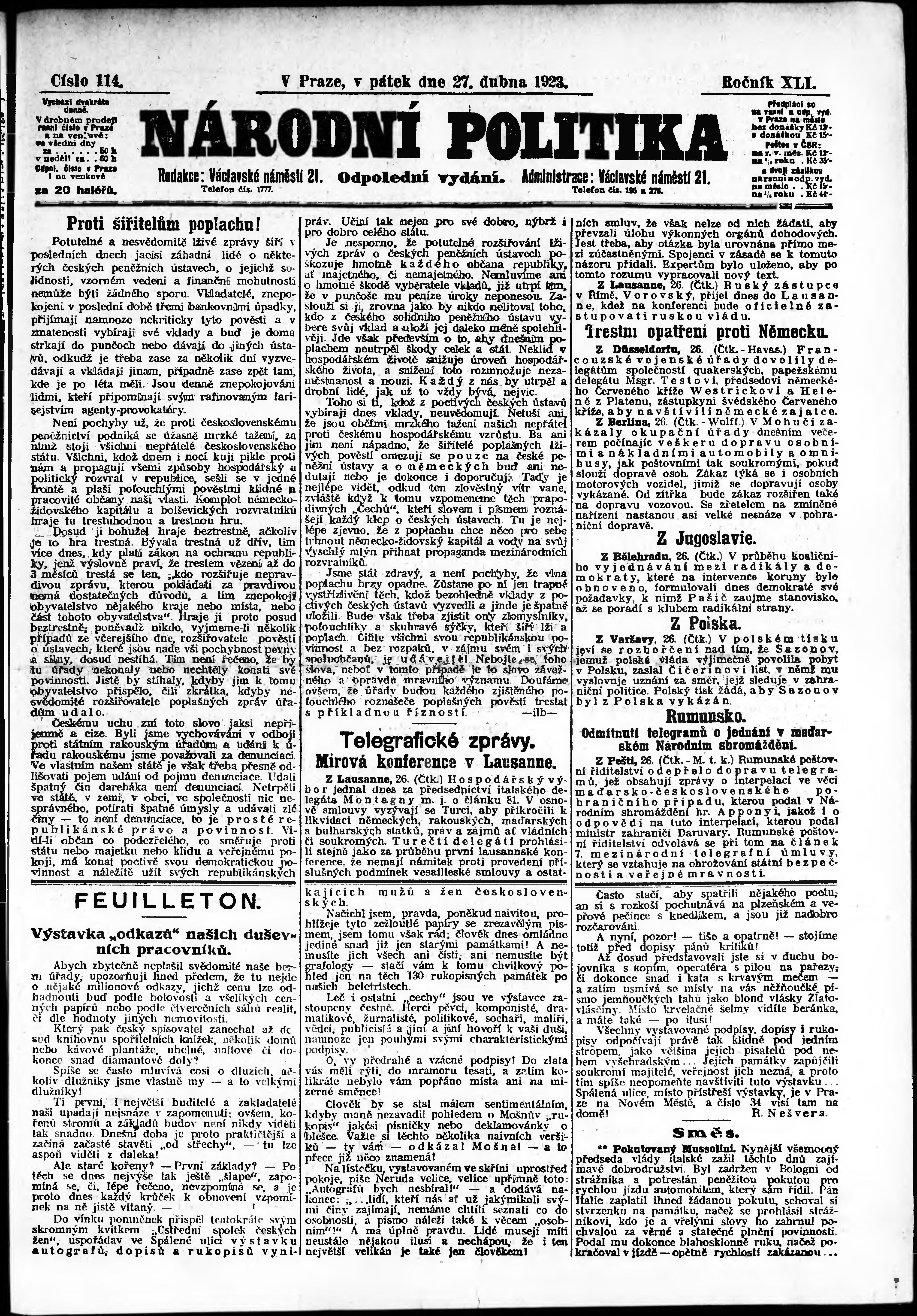 * Datum vydání výtisku: 27.4.1923 Číslo výtisku: 114 Poznámky k výtisku: odpolední vydání;