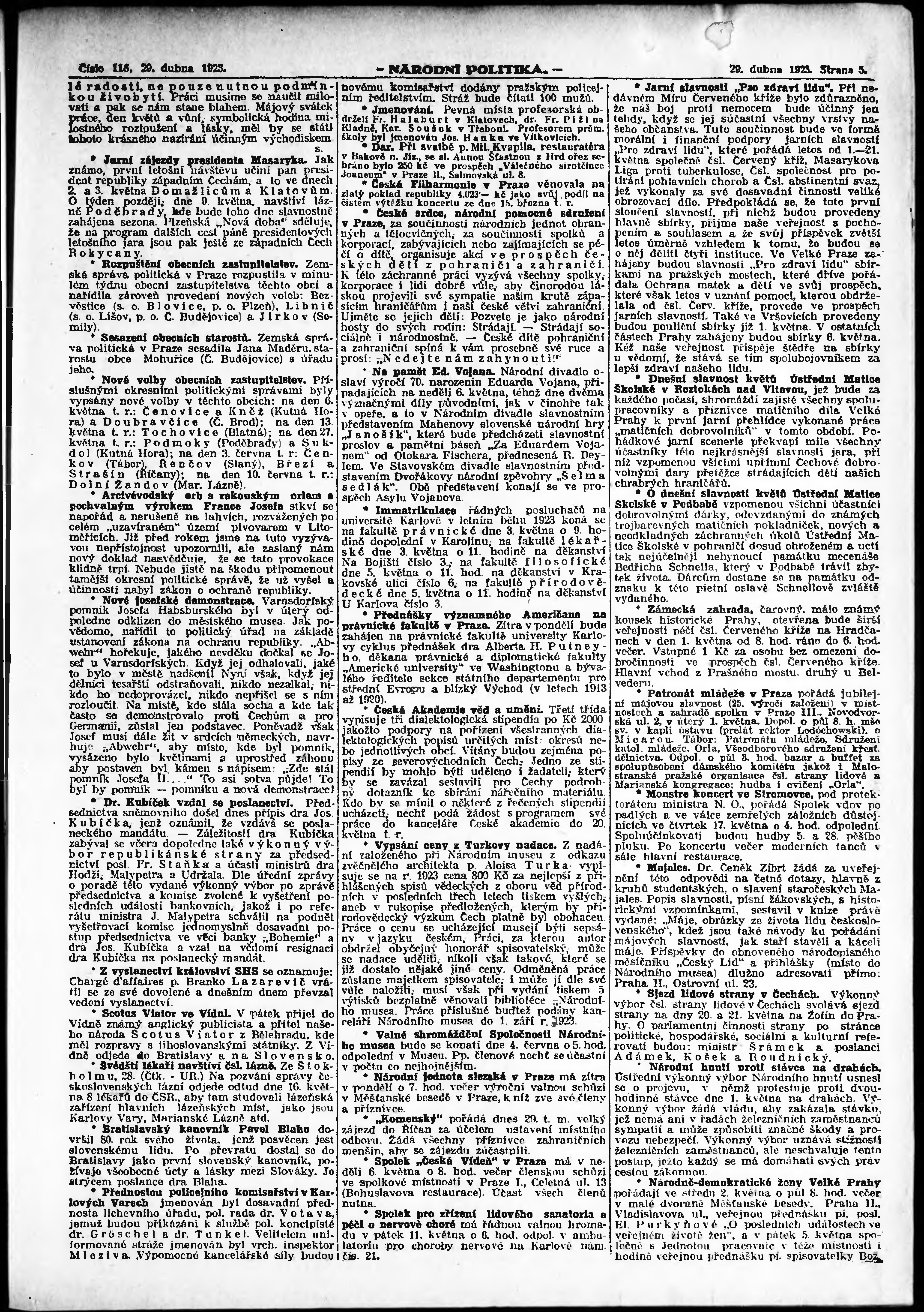 * Datum vydání výtisku: 29.4.1923 Číslo výtisku: 116 Poznámky k výtisku: ranní vydání;