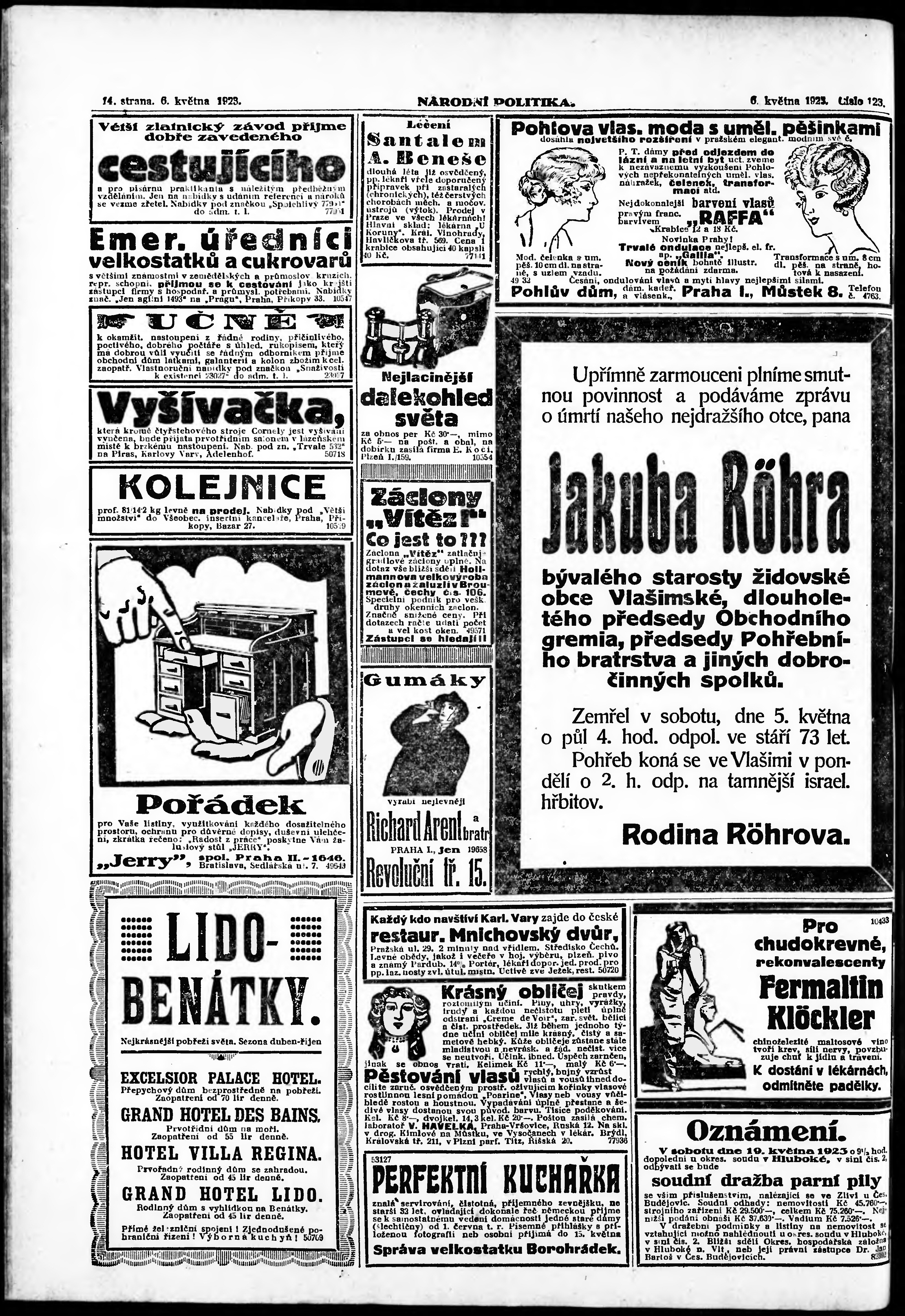 * Datum vydání výtisku: 6.5.1923 Číslo výtisku: 123 Poznámky k výtisku: ranní vydání;