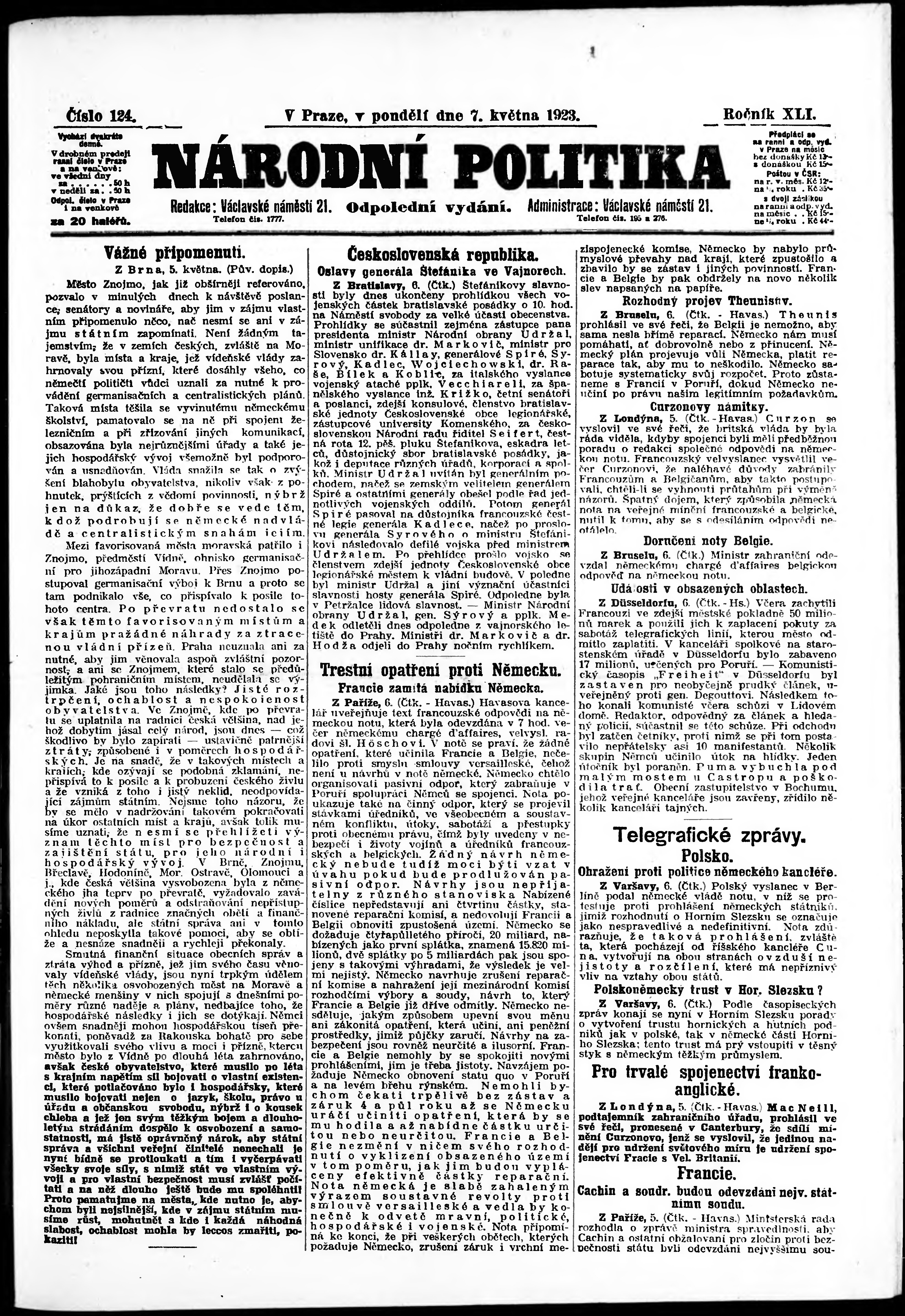 * Datum vydání výtisku: 7.5.1923 Číslo výtisku: 124 Poznámky k výtisku: odpolední vydání;