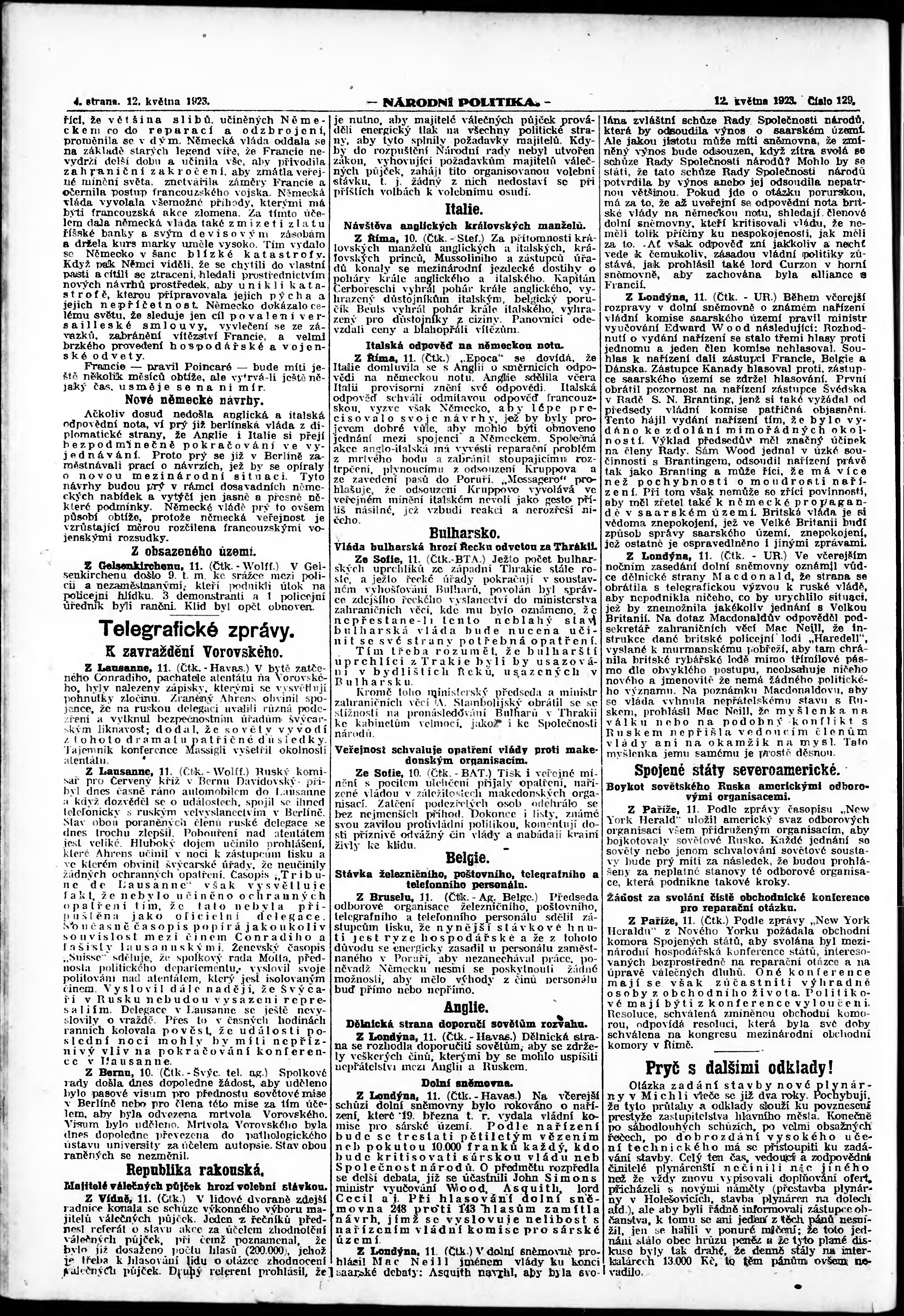 * Datum vydání výtisku: 12.5.1923 Číslo výtisku: 129 Poznámky k výtisku: ranní vydání; vydání pro Prahu;