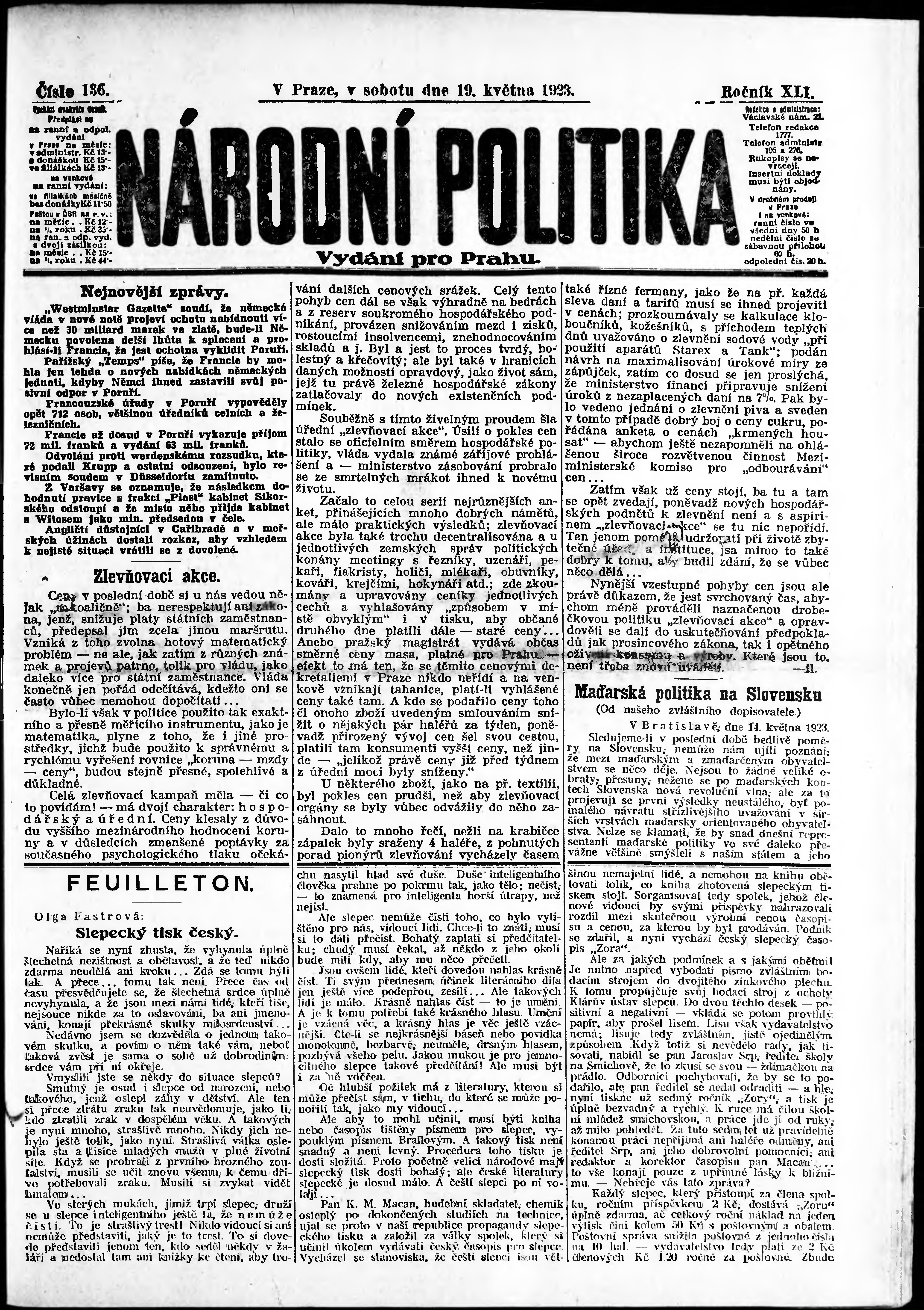 * Datum vydání výtisku: 19.5.1923 Číslo výtisku: 136 Poznámky k výtisku: ranní vydání; vydání pro Prahu;