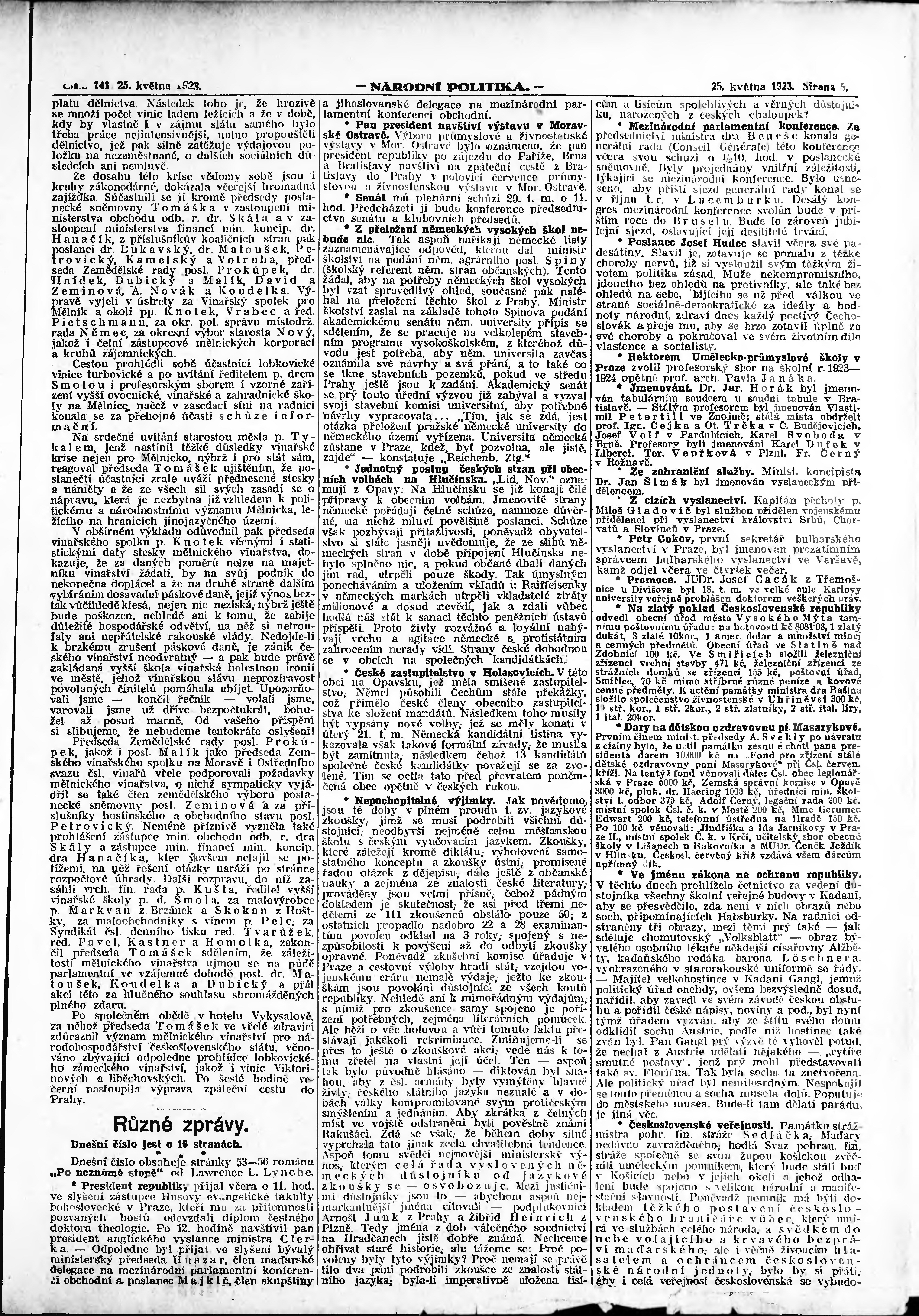 * Datum vydání výtisku: 25.5.1923 Číslo výtisku: 141 Poznámky k výtisku: ranní vydání; vydání pro Prahu;