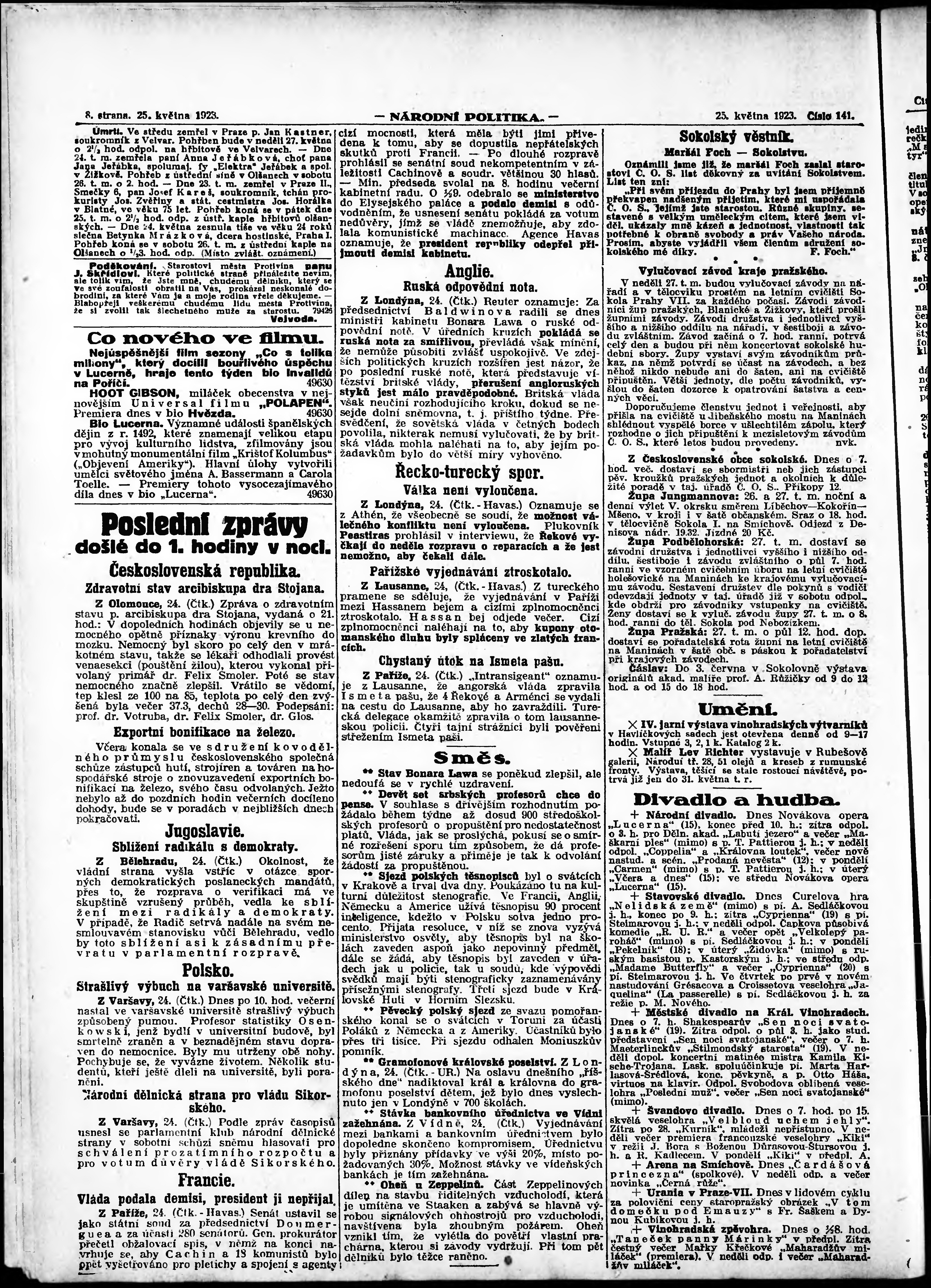 * Datum vydání výtisku: 25.5.1923 Číslo výtisku: 141 Poznámky k výtisku: ranní vydání; vydání pro Prahu;
