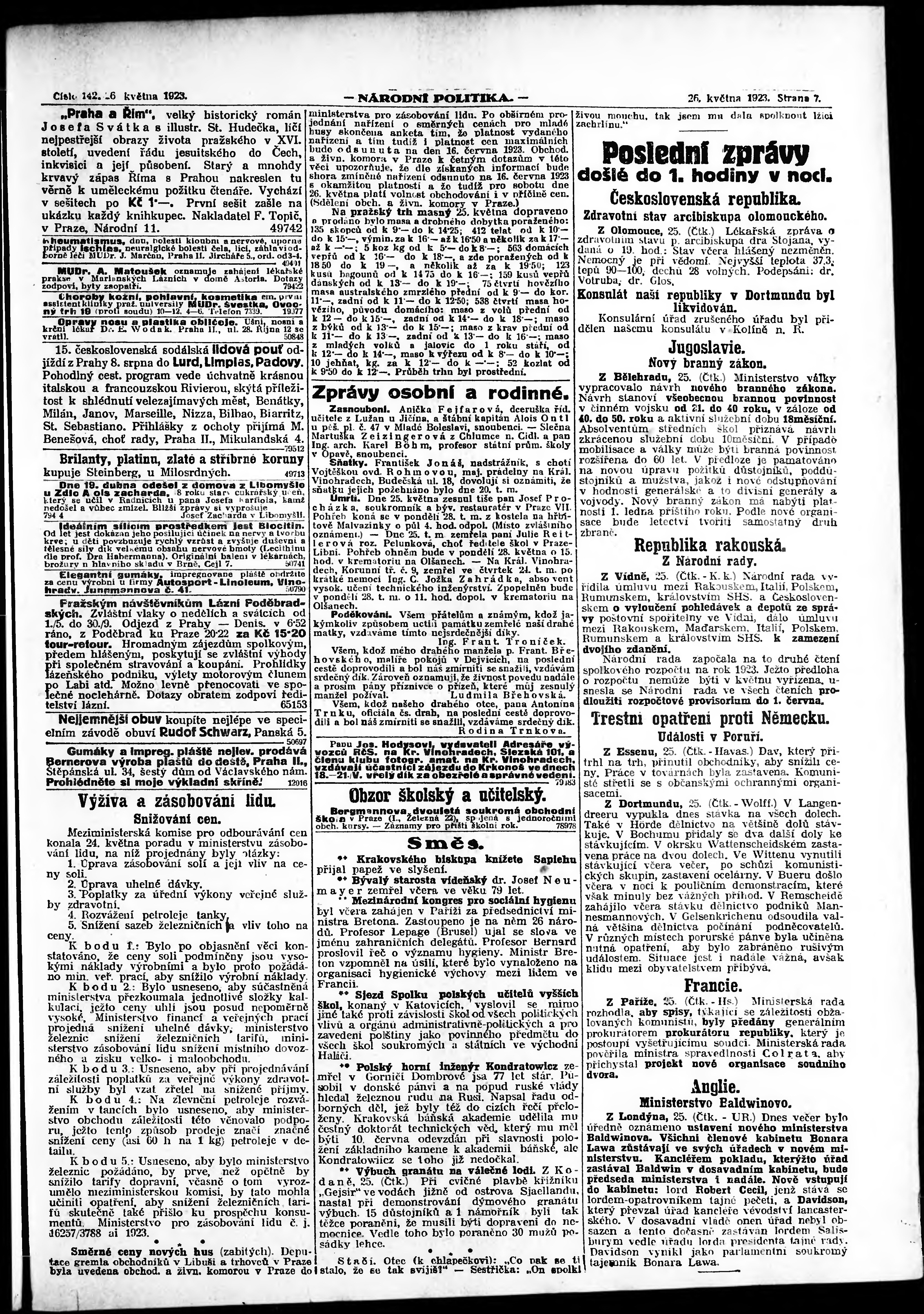 * Datum vydání výtisku: 26.5.1923 Číslo výtisku: 142 Poznámky k výtisku: ranní vydání; vydání pro Prahu;
