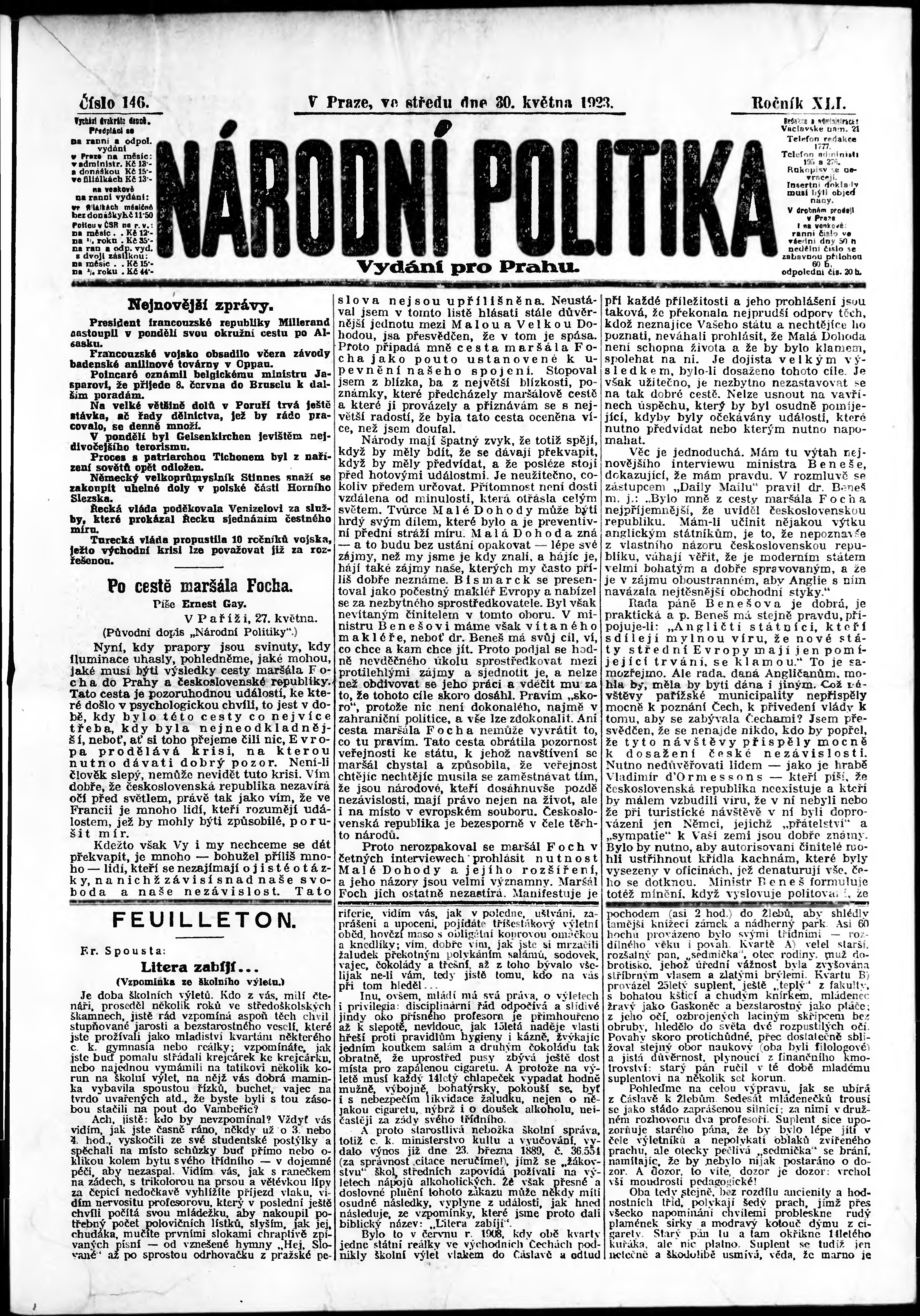 * Datum vydání výtisku: 30.5.1923 Číslo výtisku: 146 Poznámky k výtisku: ranní vydání; vydání pro Prahu;