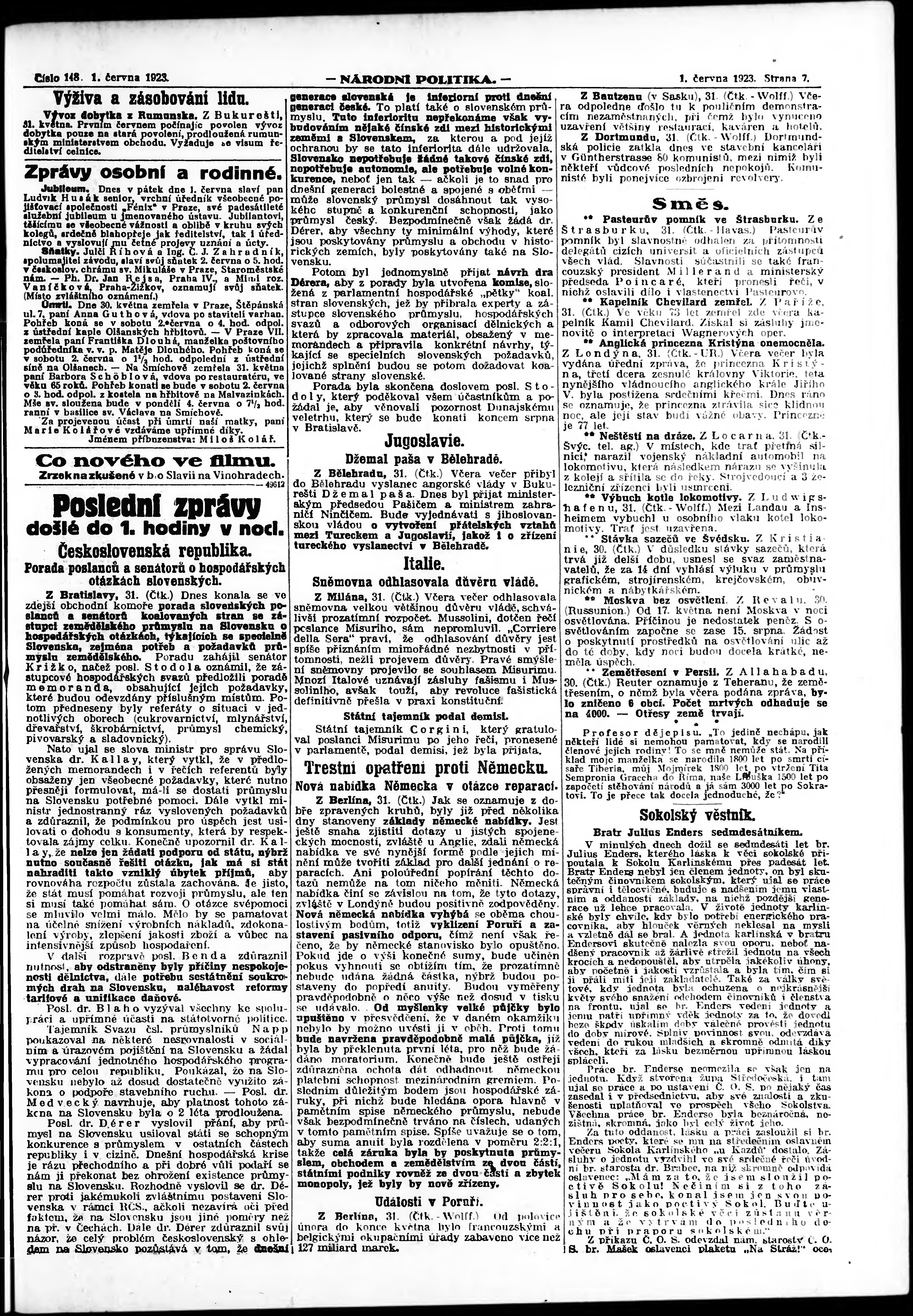 * Datum vydání výtisku: 1.6.1923 Číslo výtisku: 148 Poznámky k výtisku: ranní vydání;