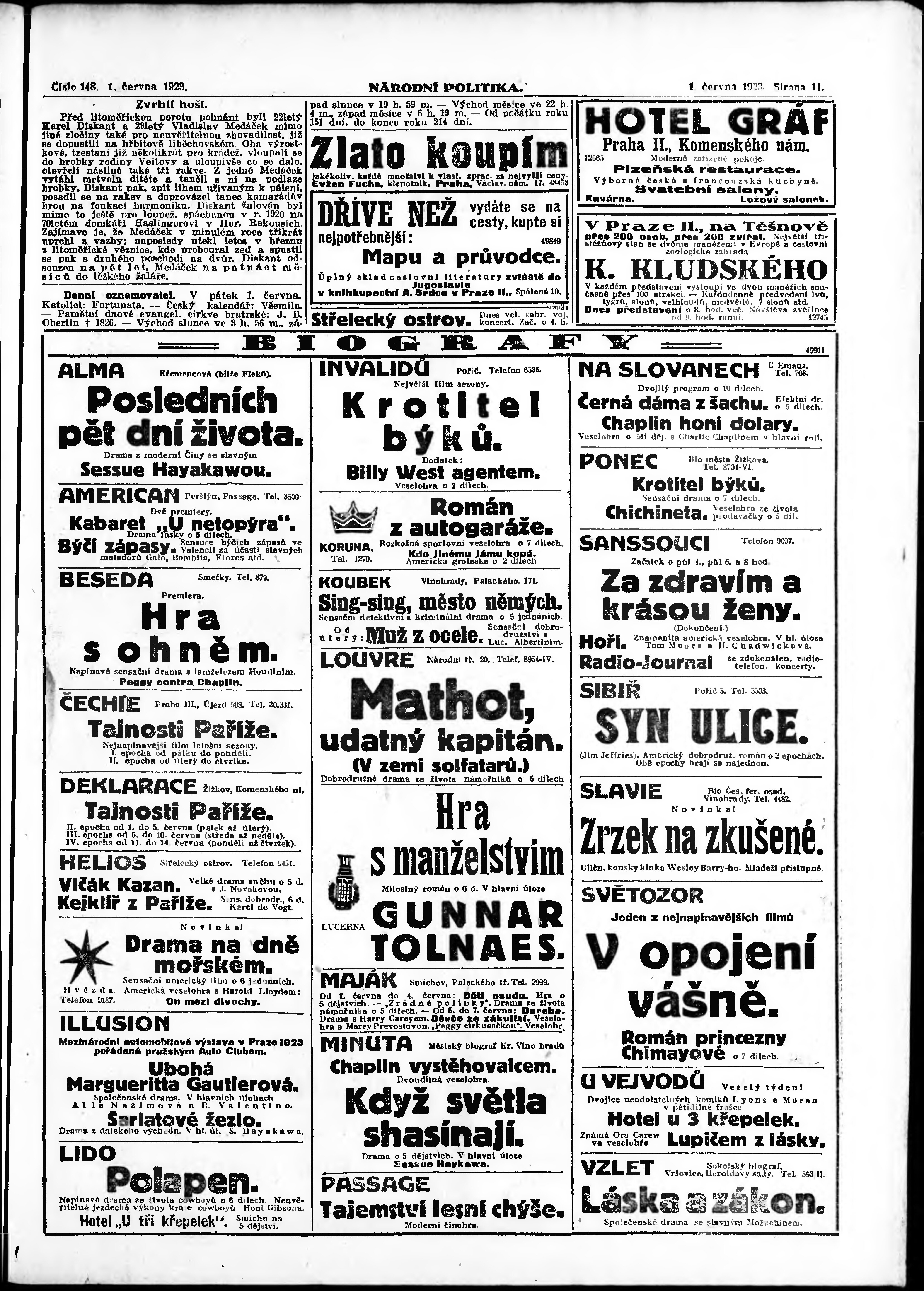 * Datum vydání výtisku: 1.6.1923 Číslo výtisku: 148 Poznámky k výtisku: ranní vydání;