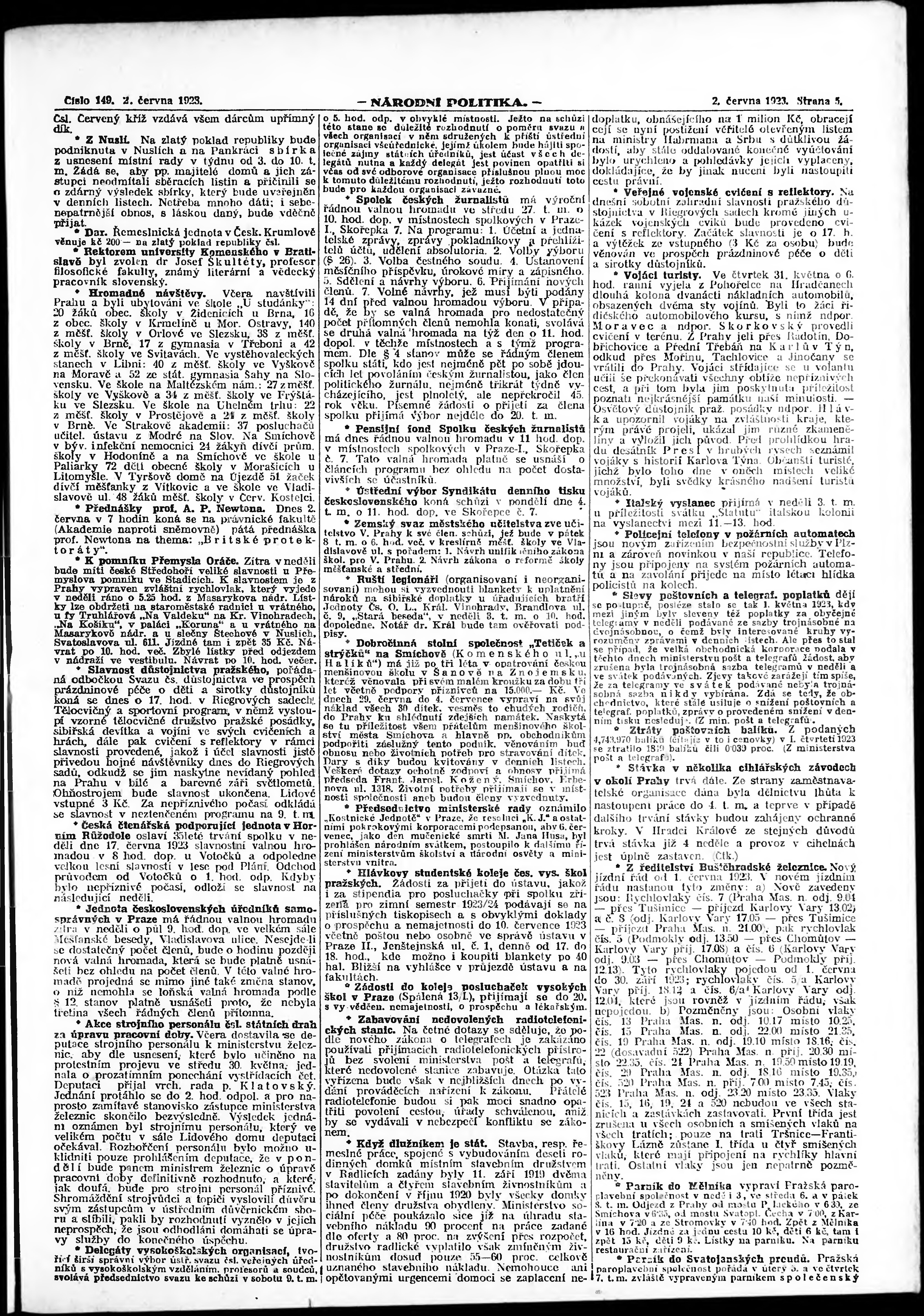 * Datum vydání výtisku: 2.6.1923 Číslo výtisku: 149 Poznámky k výtisku: ranní vydání; vydání pro Prahu;