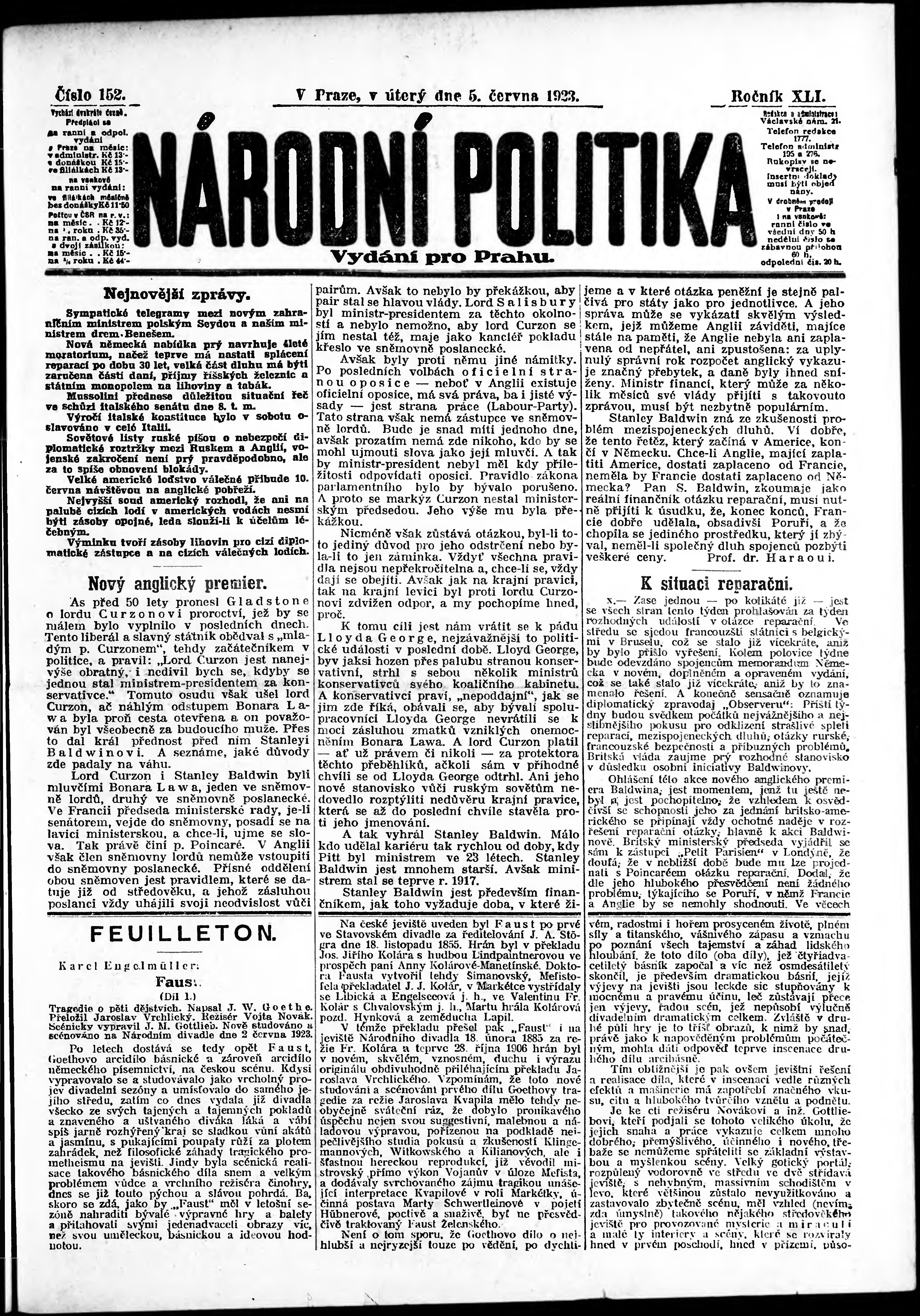 * Datum vydání výtisku: 5.6.1923 Číslo výtisku: 152 Poznámky k výtisku: ranní vydání; vydání pro Prahu;