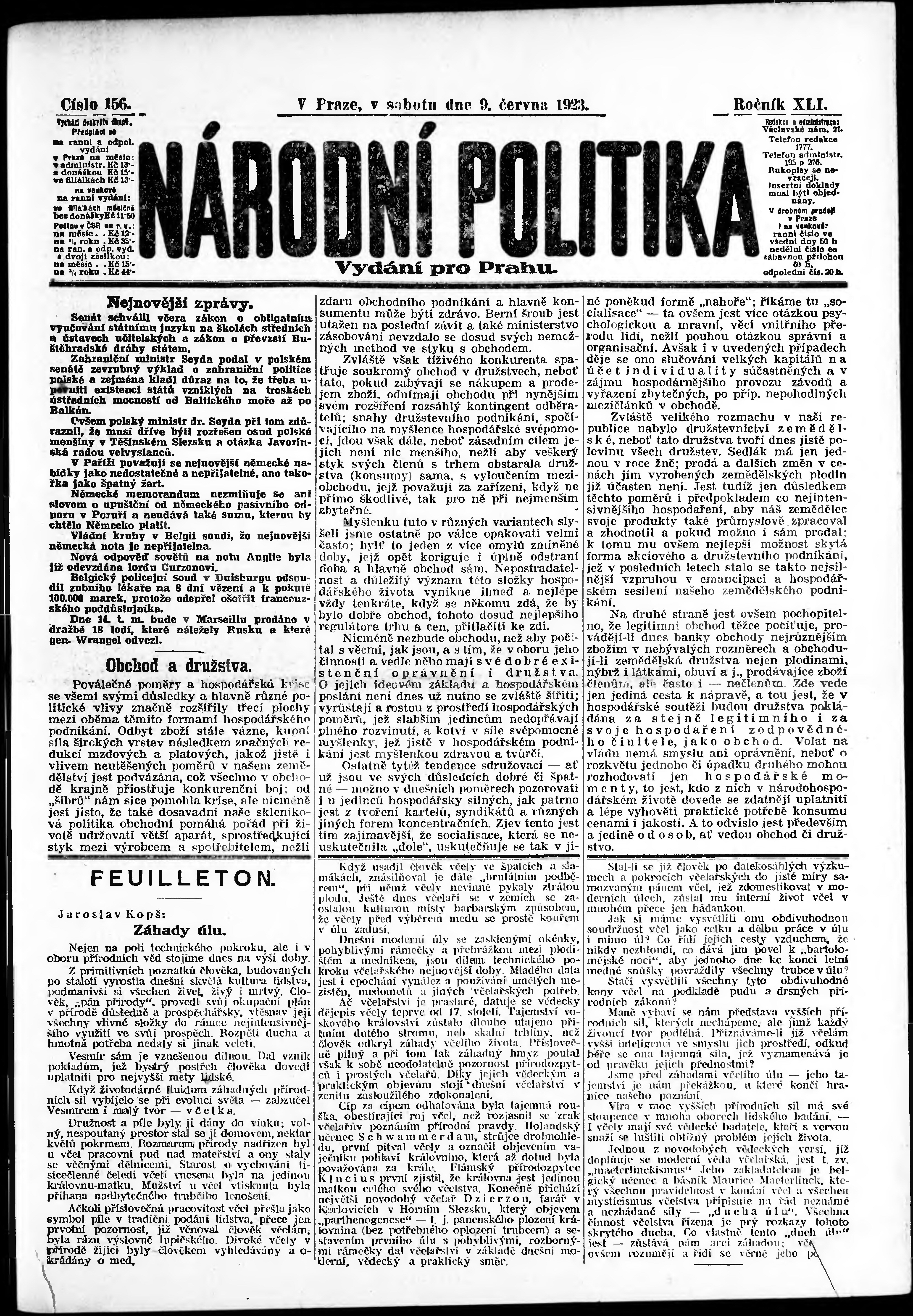 * Datum vydání výtisku: 9.6.1923 Číslo výtisku: 156 Poznámky k výtisku: ranní vydání; vydání pro Prahu;