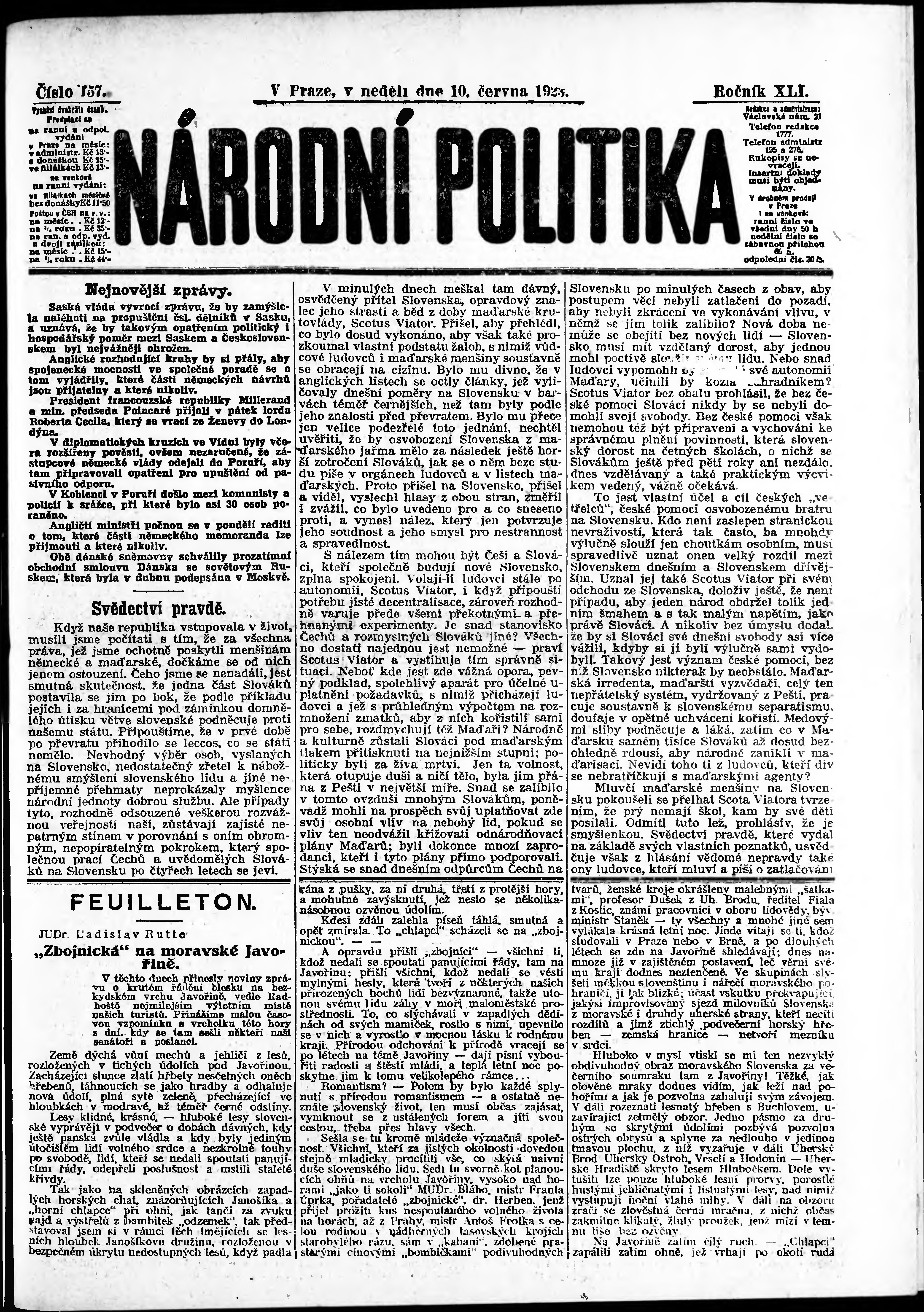 * Datum vydání výtisku: 10.6.1923 Číslo výtisku: 157 Poznámky k výtisku: ranní vydání;