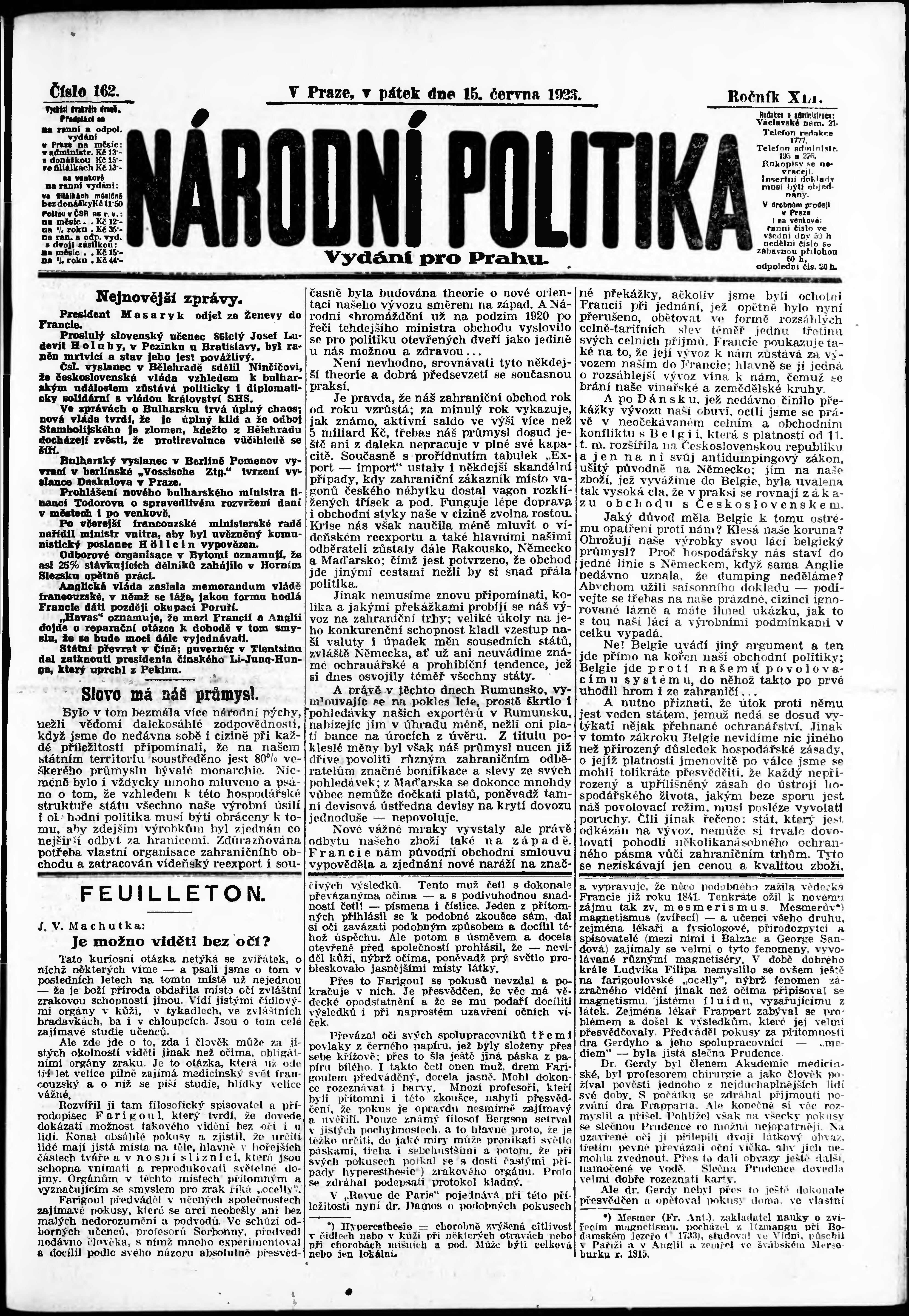 * Datum vydání výtisku: 15.6.1923 Číslo výtisku: 162 Poznámky k výtisku: ranní vydání; vydání pro Prahu;