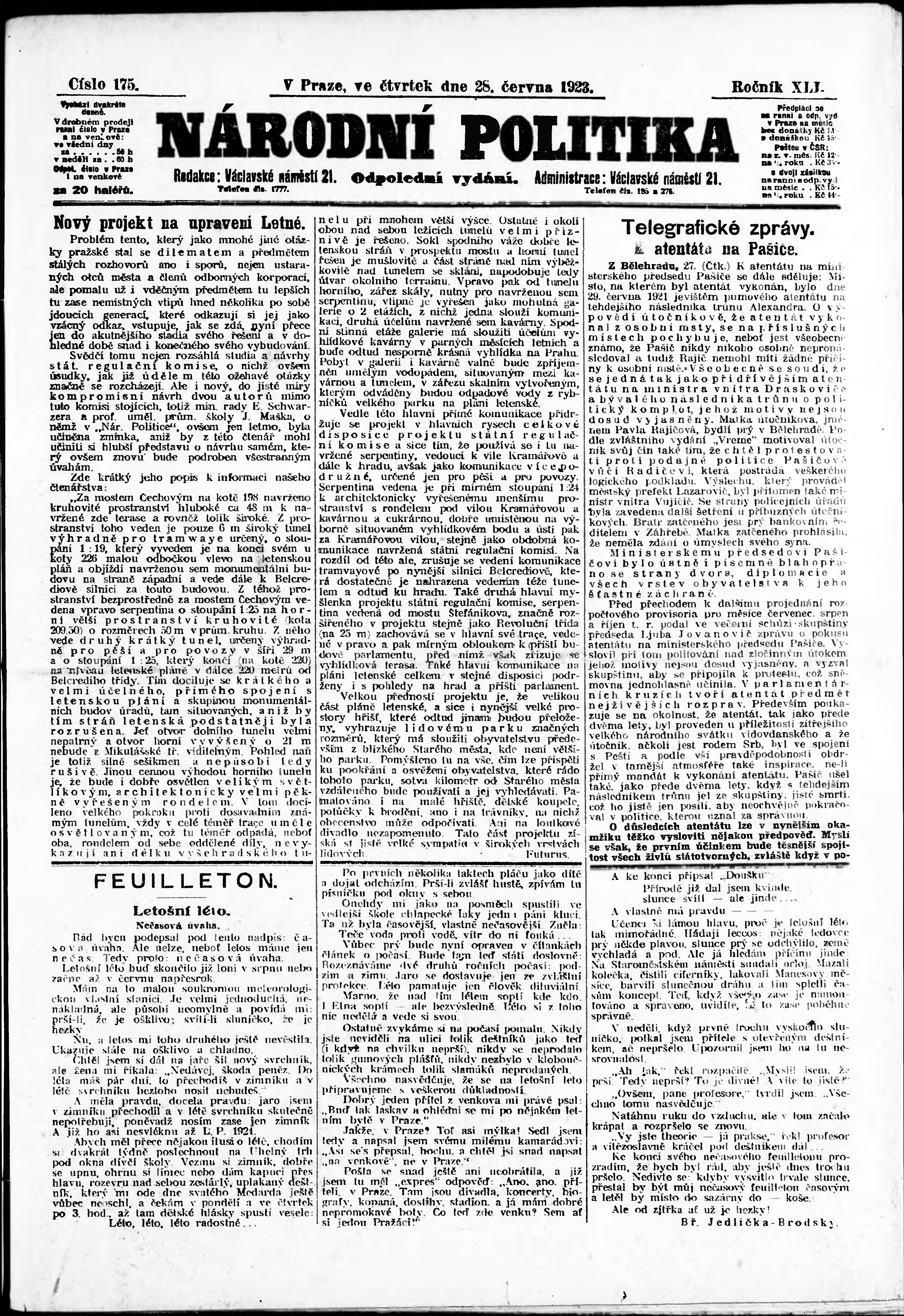 * Datum vydání výtisku: 28.6.1923 Číslo výtisku: 175 Poznámky k výtisku: odpolední vydání;