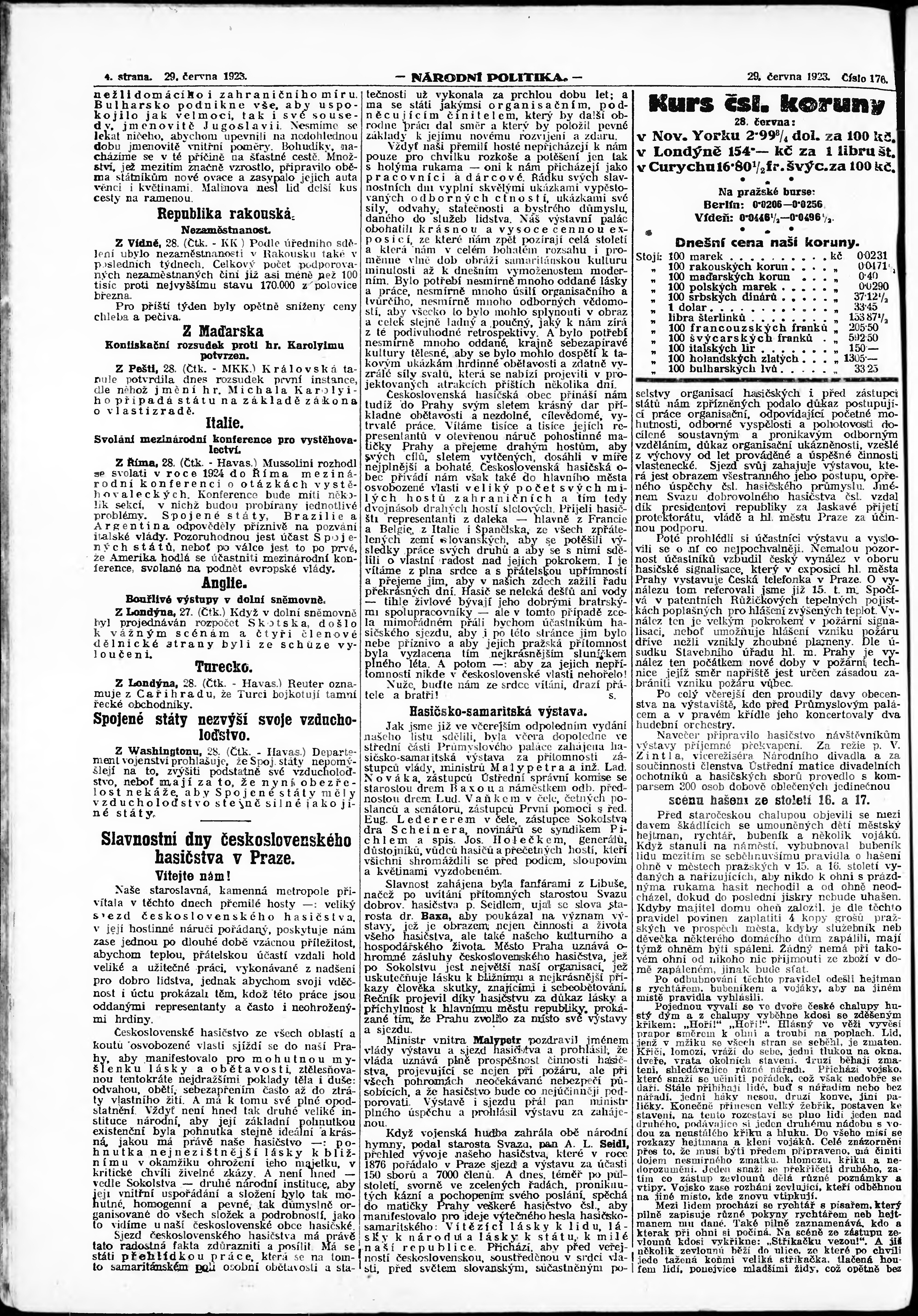 * Datum vydání výtisku: 29.6.1923 Číslo výtisku: 176 Poznámky k výtisku: ranní vydání;