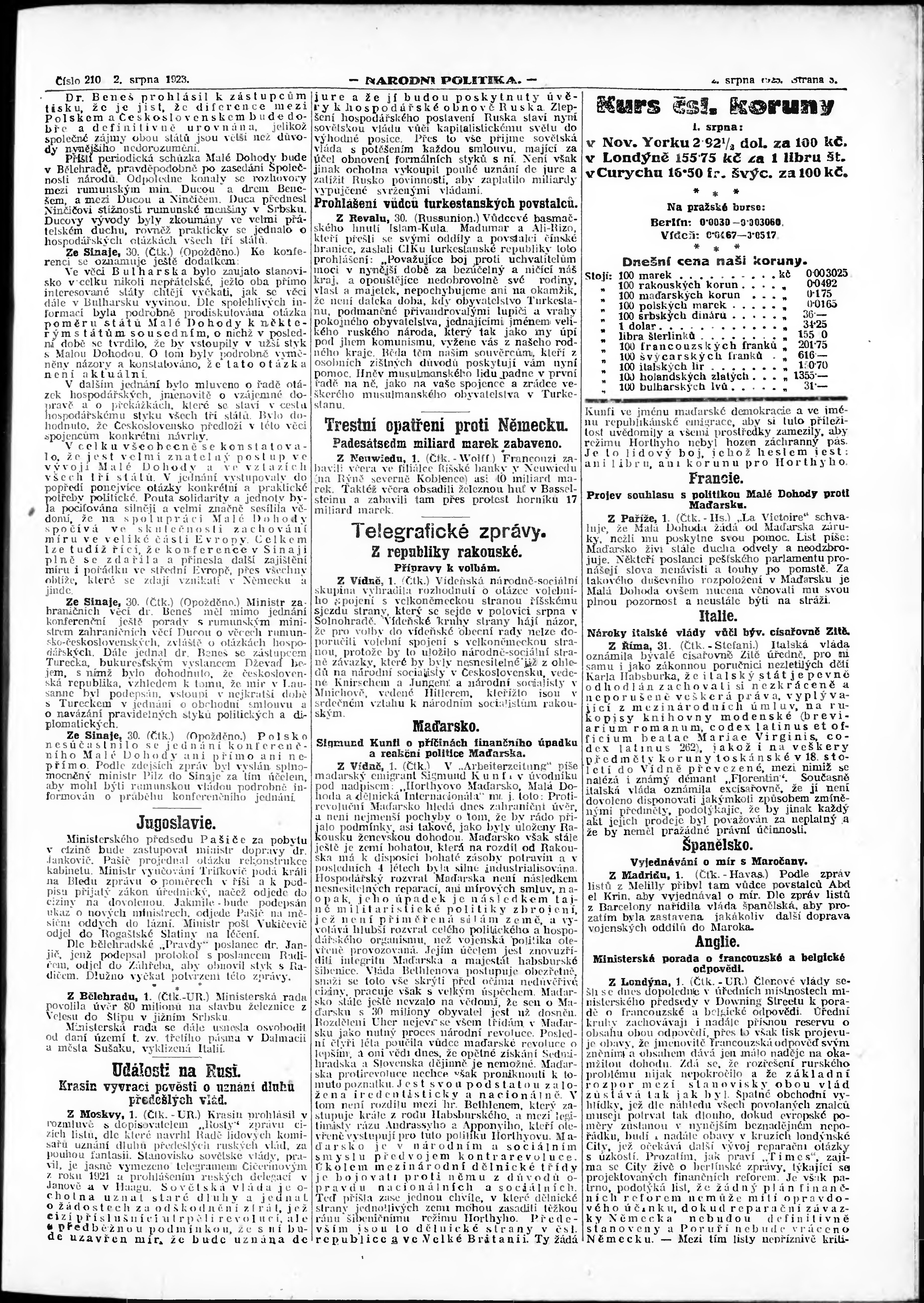 * Datum vydání výtisku: 2.8.1923 Číslo výtisku: 210 Poznámky k výtisku: ranní vydání; vydání pro Prahu;