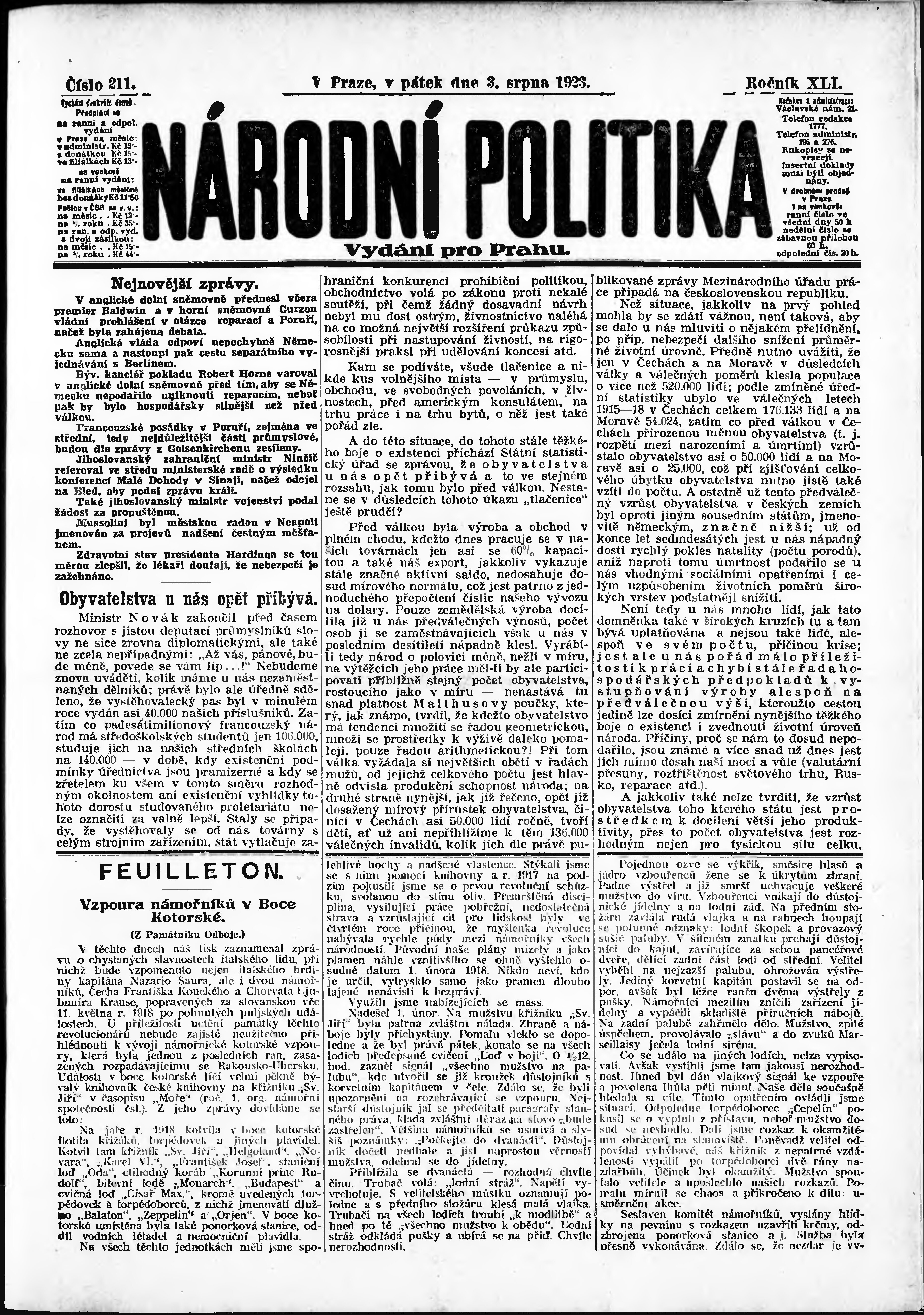 * Datum vydání výtisku: 3.8.1923 Číslo výtisku: 211 Poznámky k výtisku: ranní vydání; vydání pro Prahu;