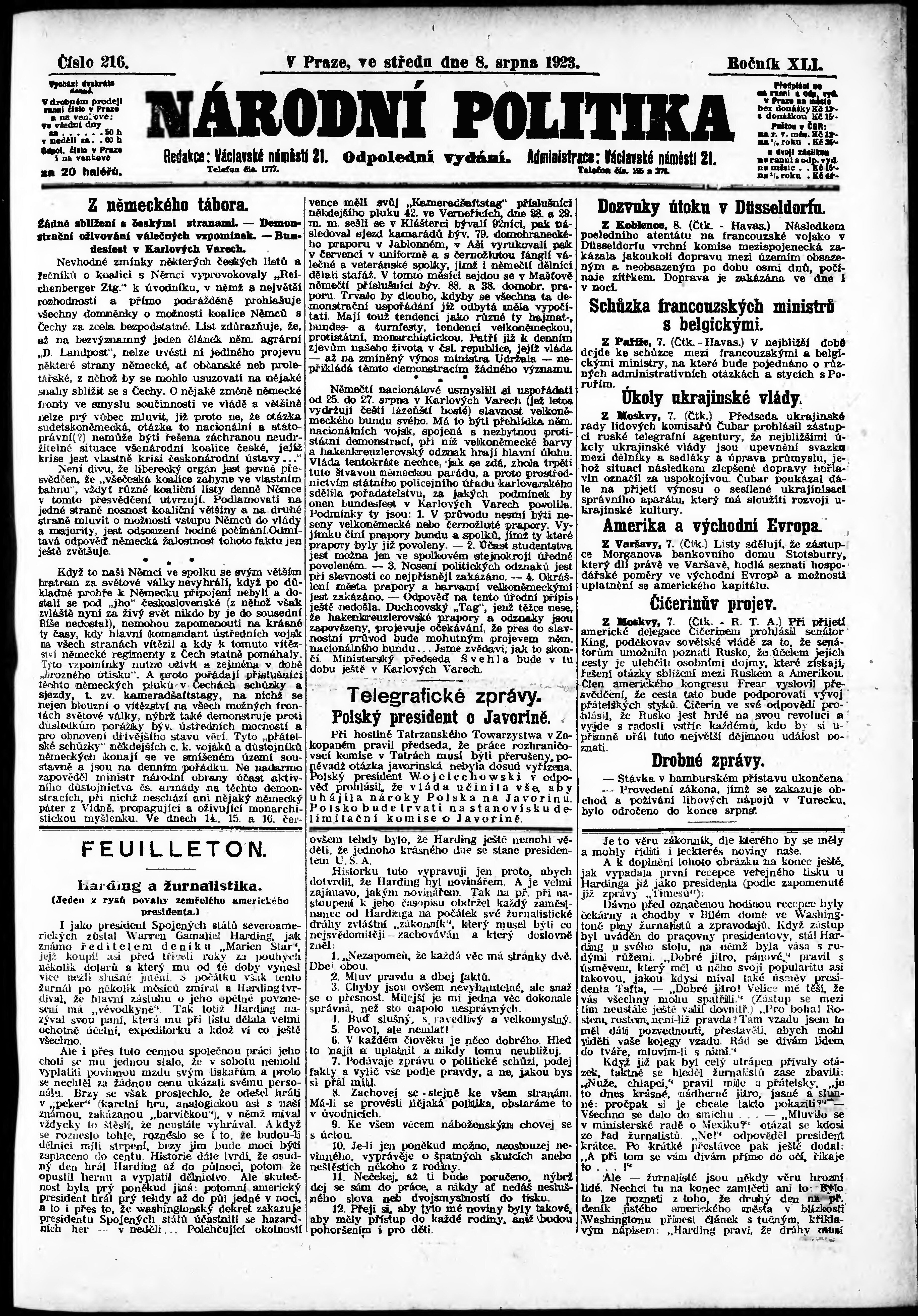 * Datum vydání výtisku: 8.8.1923 Číslo výtisku: 216 Poznámky k výtisku: odpolední vydání;