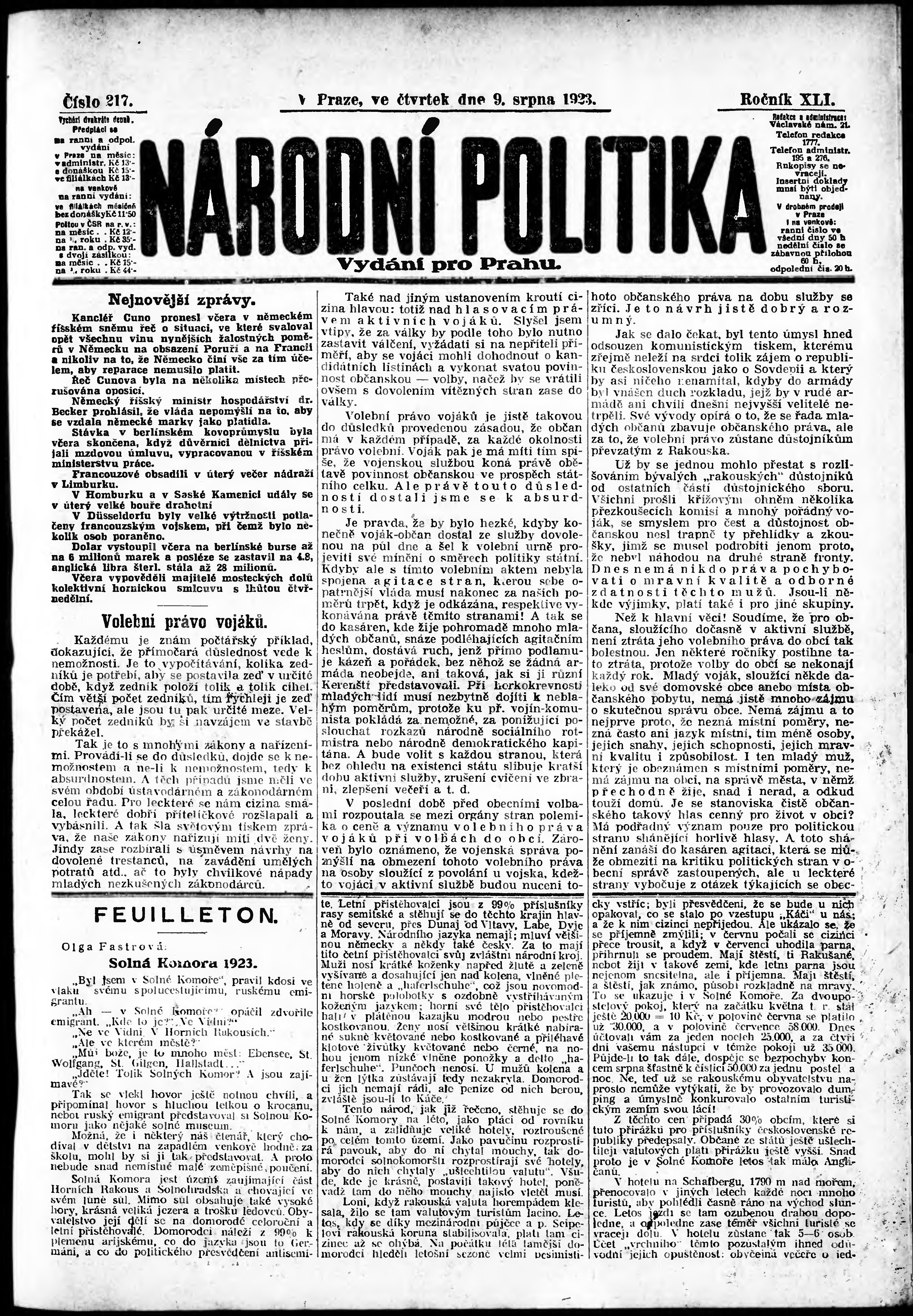 * Datum vydání výtisku: 9.8.1923 Číslo výtisku: 217 Poznámky k výtisku: ranní vydání; vydání pro Prahu;