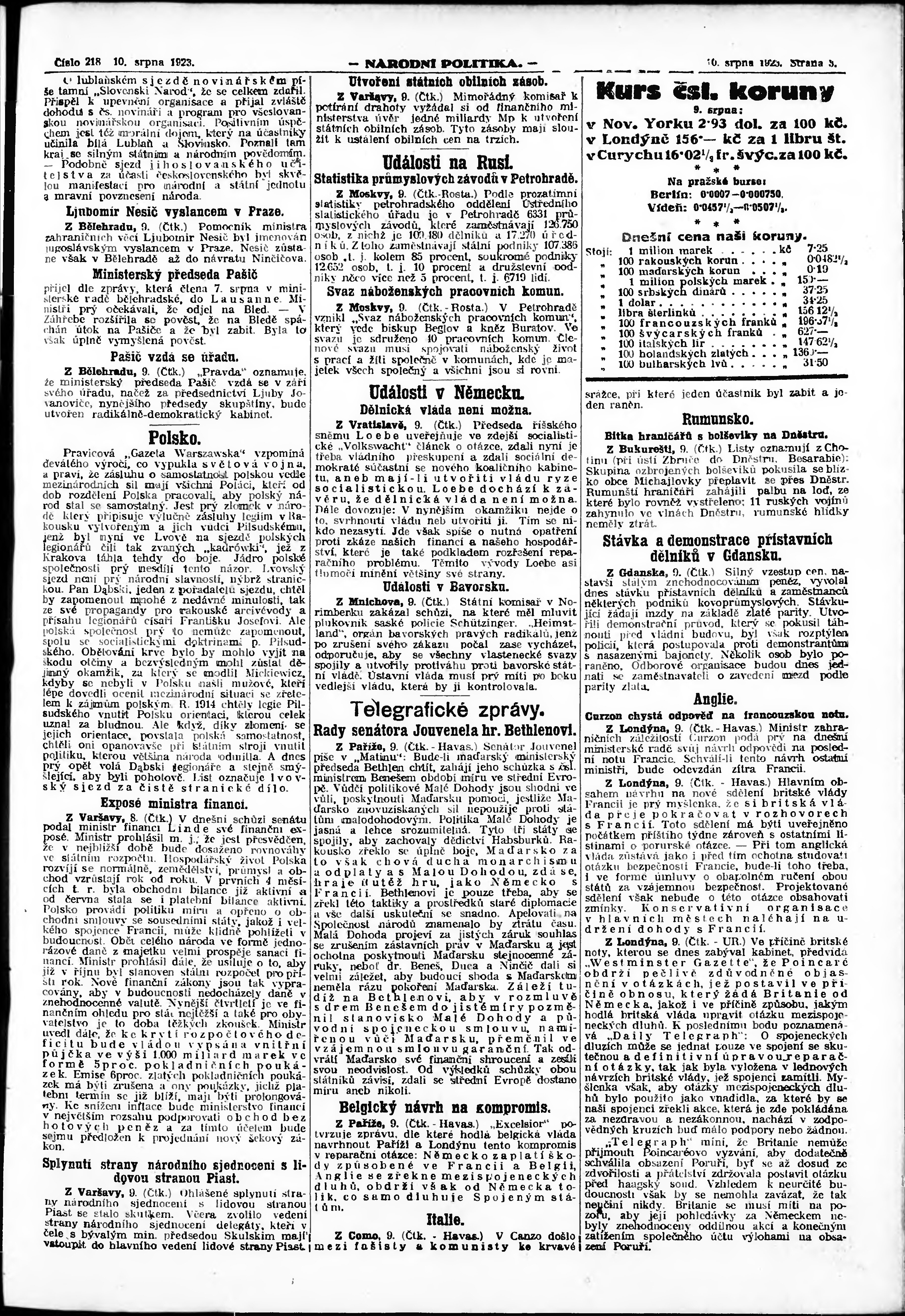 * Datum vydání výtisku: 10.8.1923 Číslo výtisku: 218 Poznámky k výtisku: ranní vydání; vydání pro Prahu;