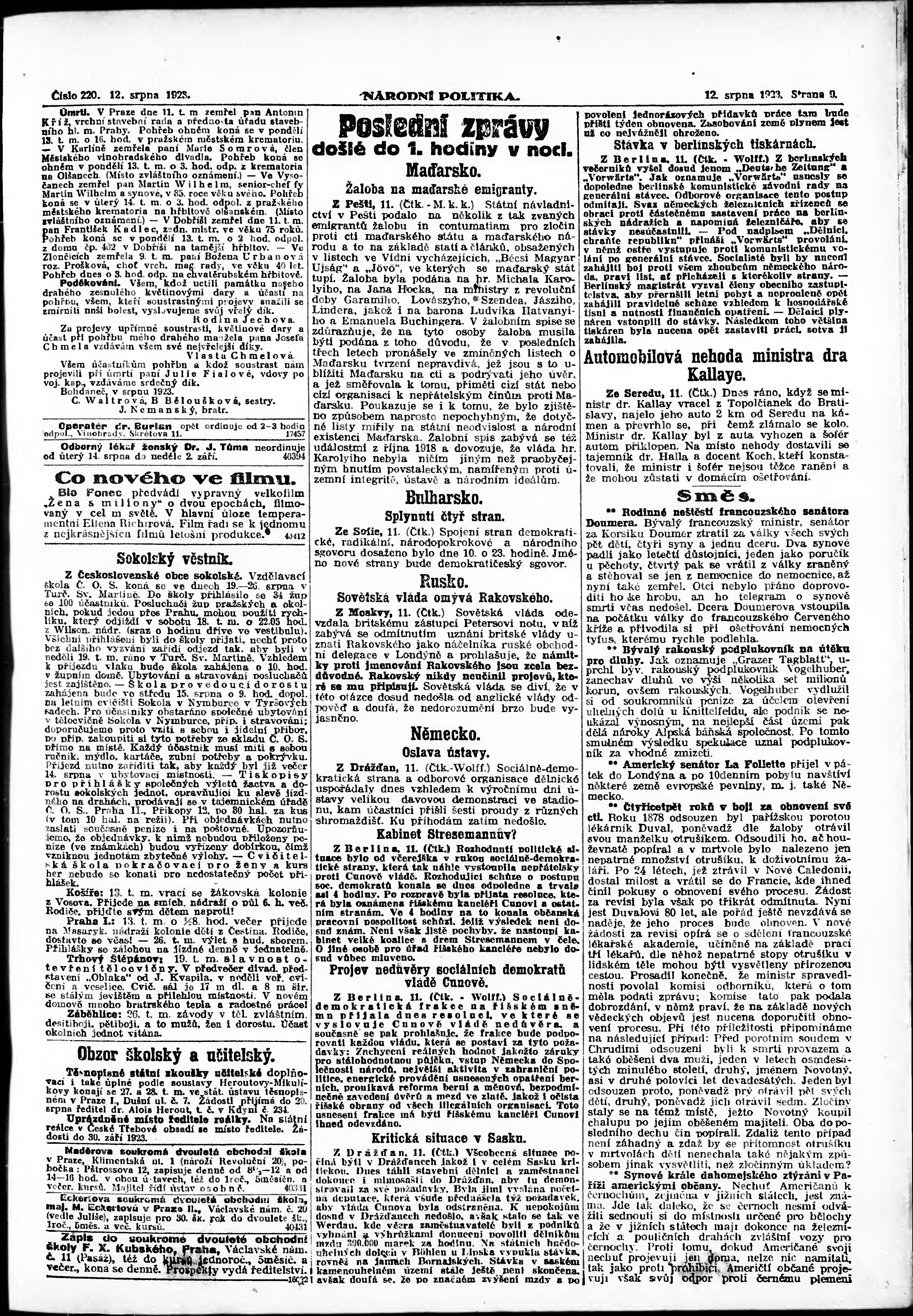 * Datum vydání výtisku: 12.8.1923 Číslo výtisku: 220 Poznámky k výtisku: ranní vydání;