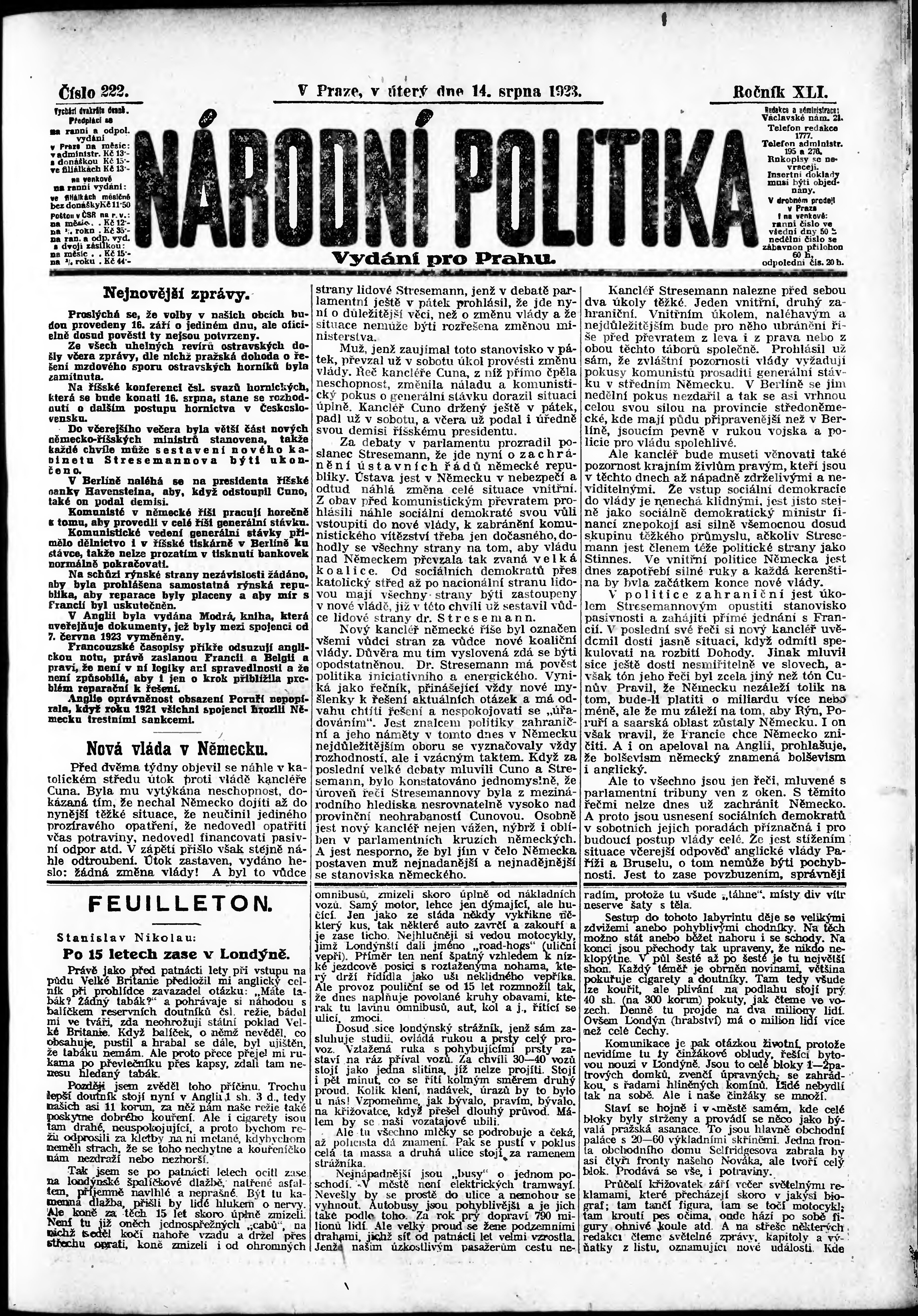 * Datum vydání výtisku: 14.8.1923 Číslo výtisku: 222 Poznámky k výtisku: ranní vydání; vydání pro Prahu;