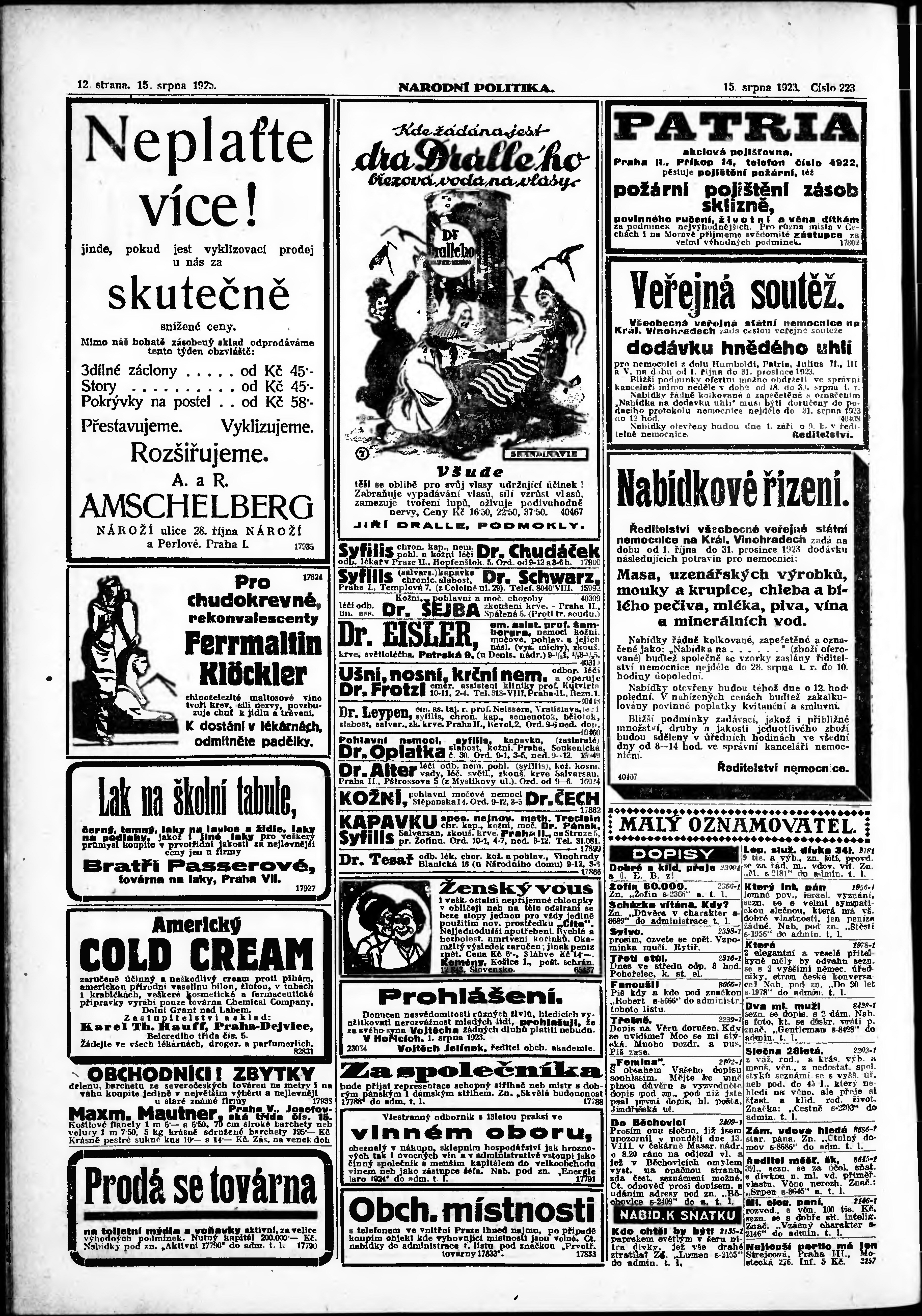 * Datum vydání výtisku: 15.8.1923 Číslo výtisku: 223 Poznámky k výtisku: ranní vydání;