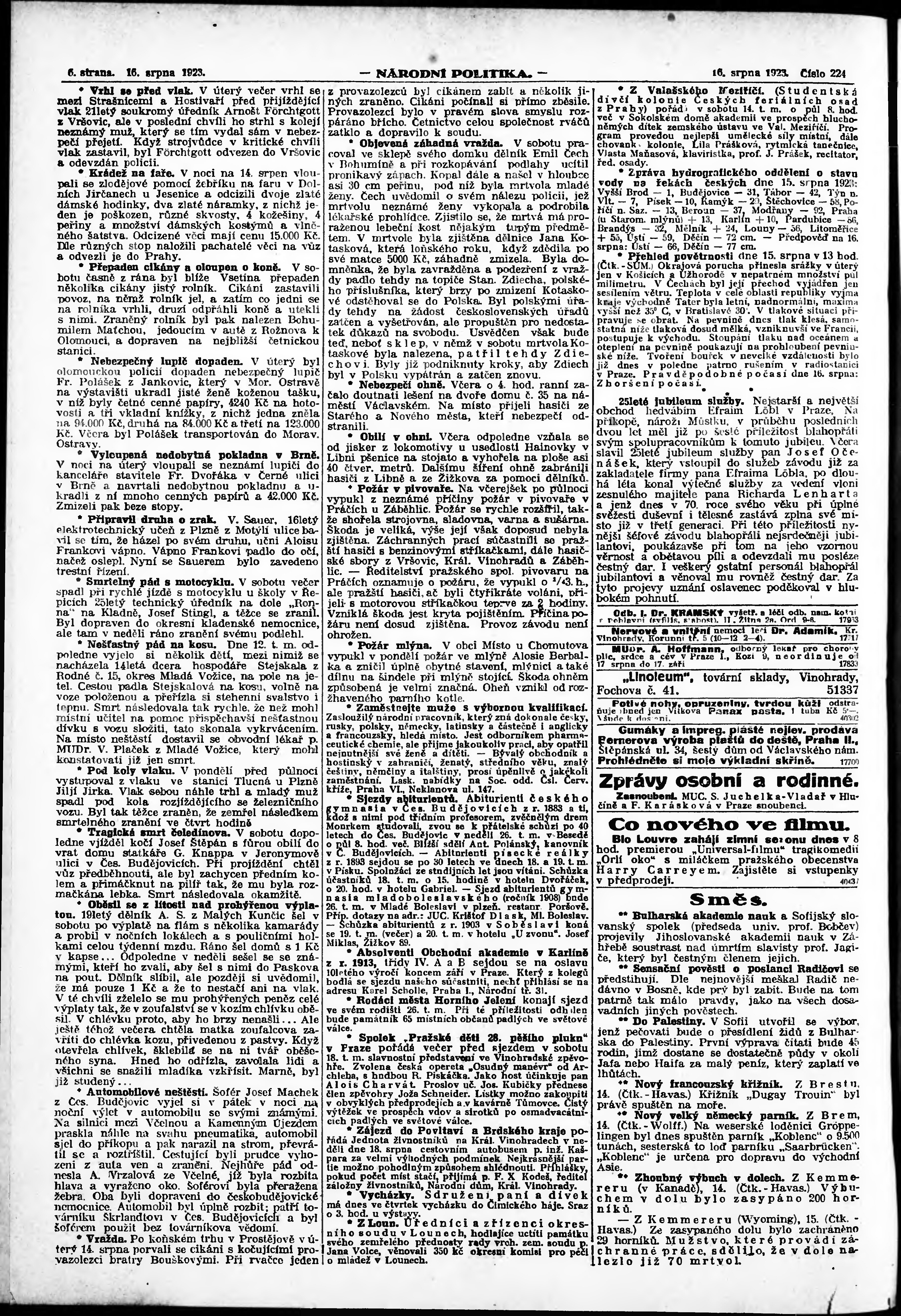 * Datum vydání výtisku: 16.8.1923 Číslo výtisku: 224 Poznámky k výtisku: ranní vydání;