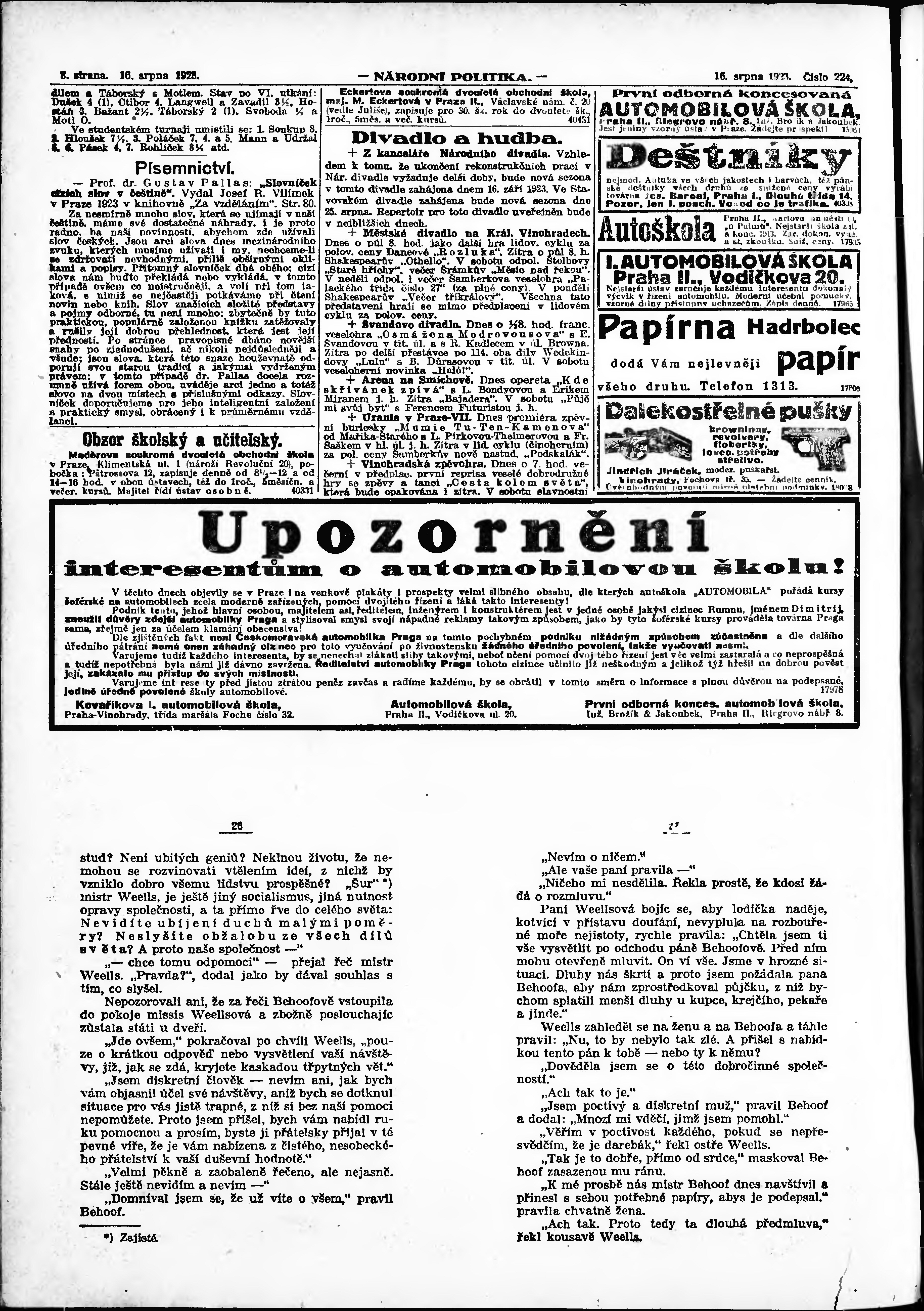 * Datum vydání výtisku: 16.8.1923 Číslo výtisku: 224 Poznámky k výtisku: ranní vydání;