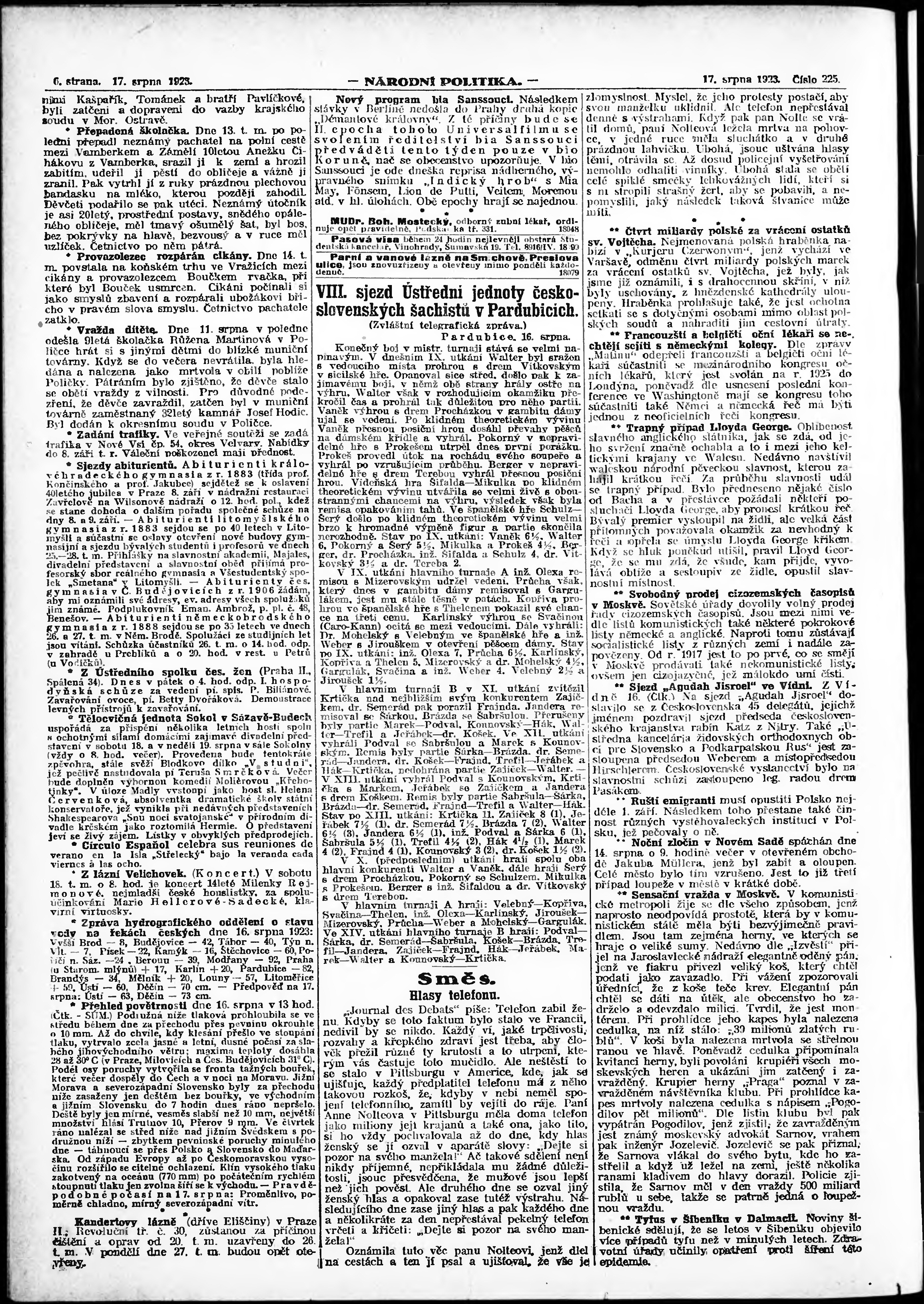* Datum vydání výtisku: 17.8.1923 Číslo výtisku: 225 Poznámky k výtisku: ranní vydání; vydání pro Prahu;