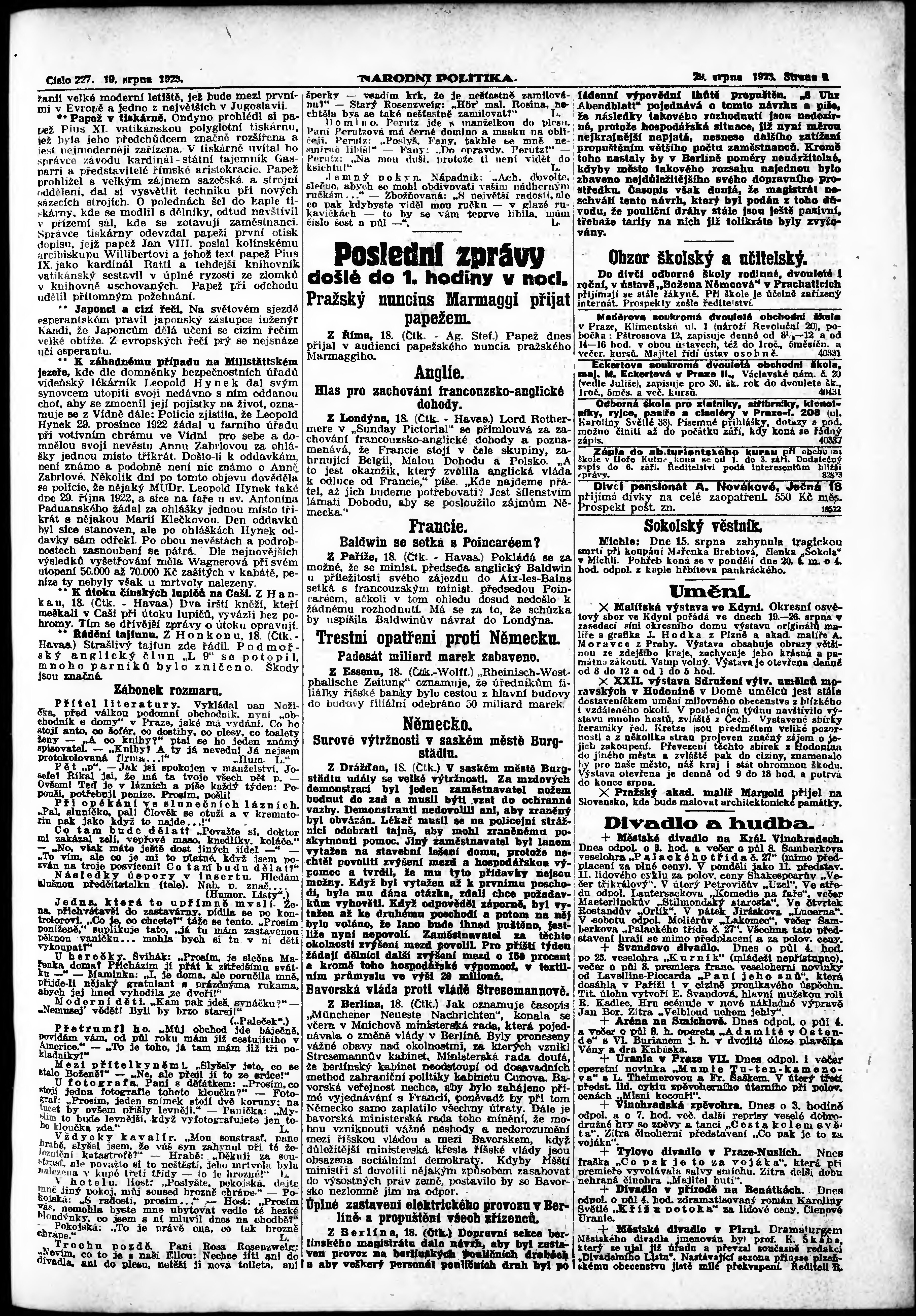 * Datum vydání výtisku: 19.8.1923 Číslo výtisku: 227 Poznámky k výtisku: ranní vydání;
