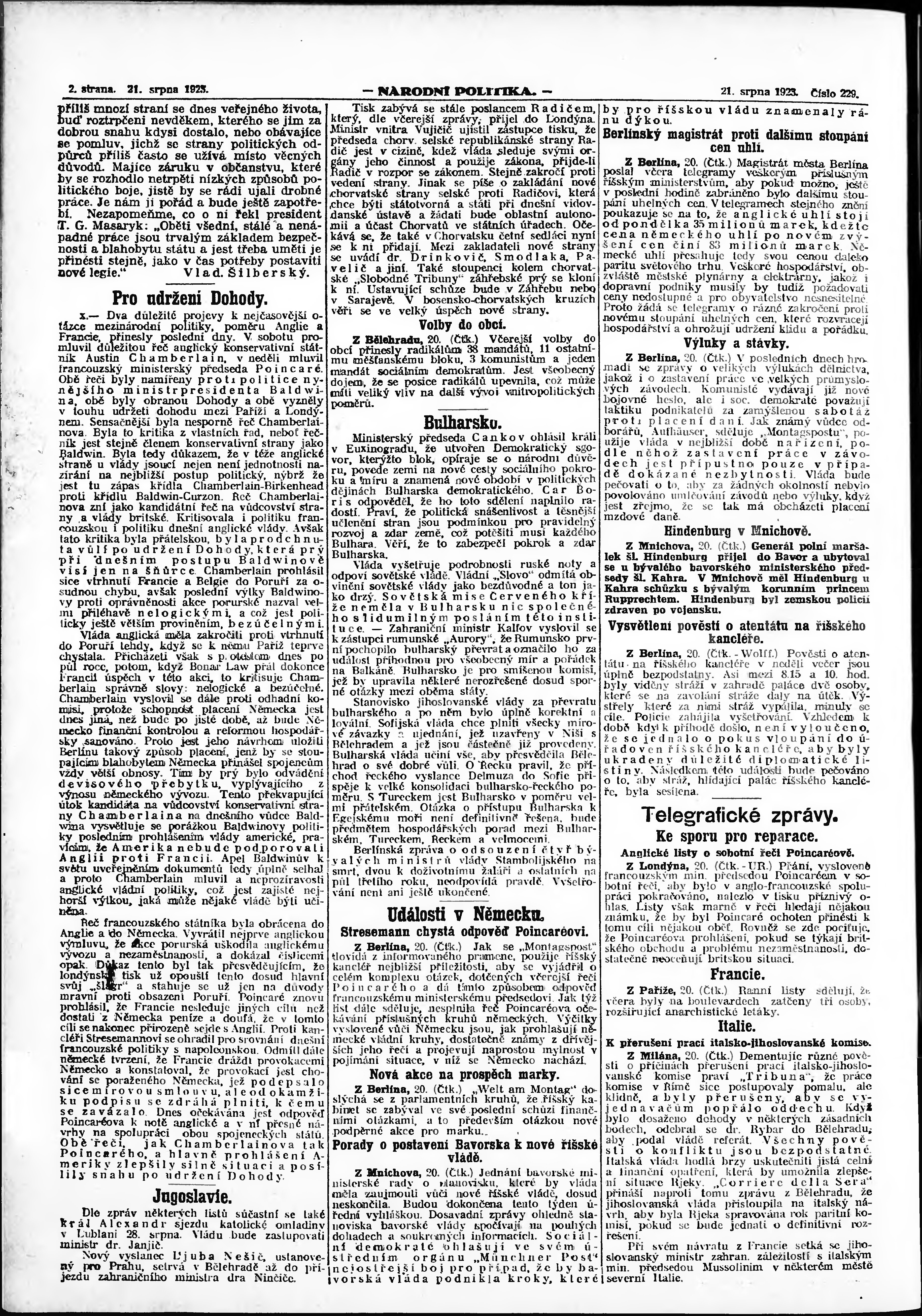 * Datum vydání výtisku: 21.8.1923 Číslo výtisku: 229 Poznámky k výtisku: ranní vydání; vydání pro Prahu;