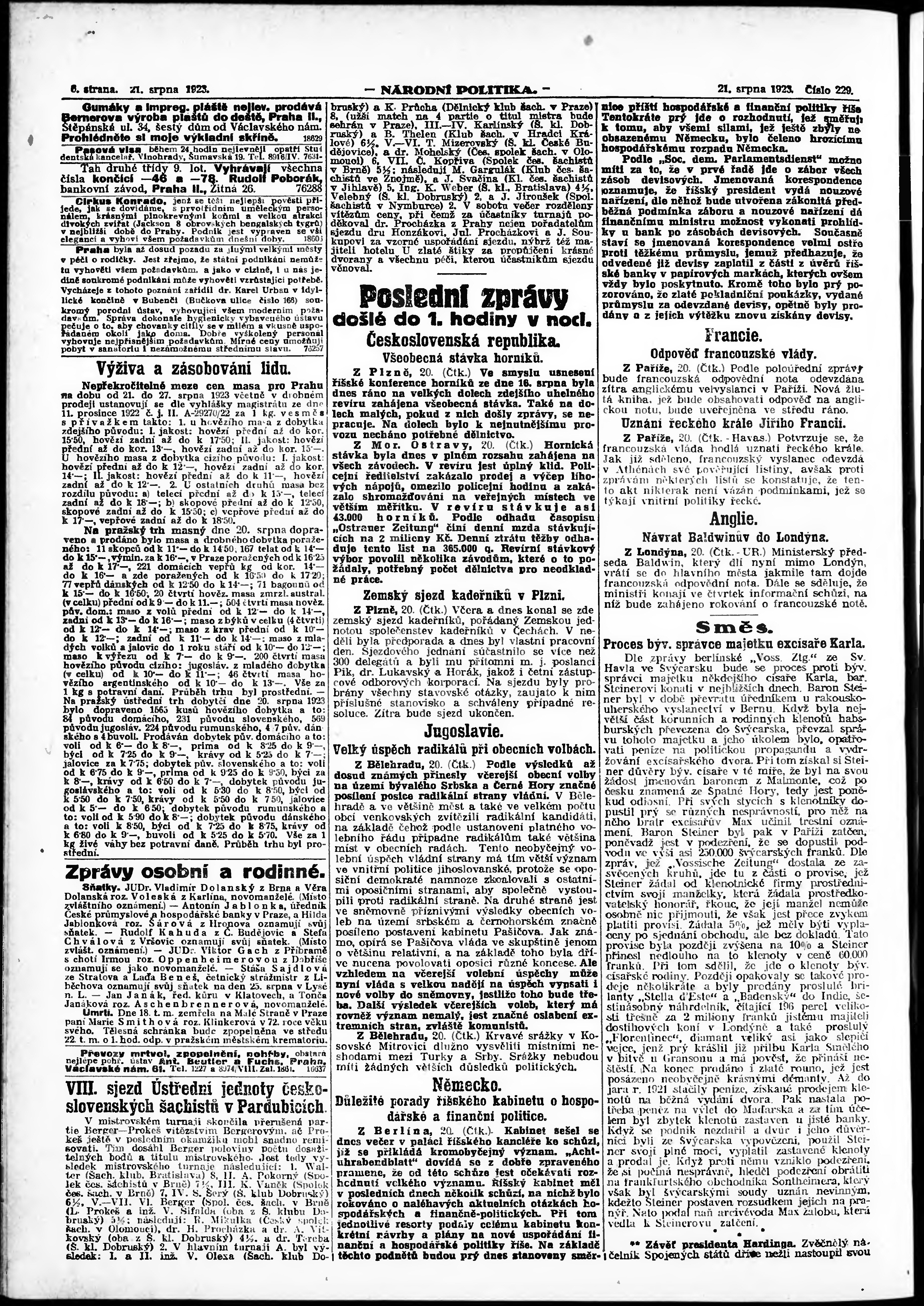 * Datum vydání výtisku: 21.8.1923 Číslo výtisku: 229 Poznámky k výtisku: ranní vydání; vydání pro Prahu;
