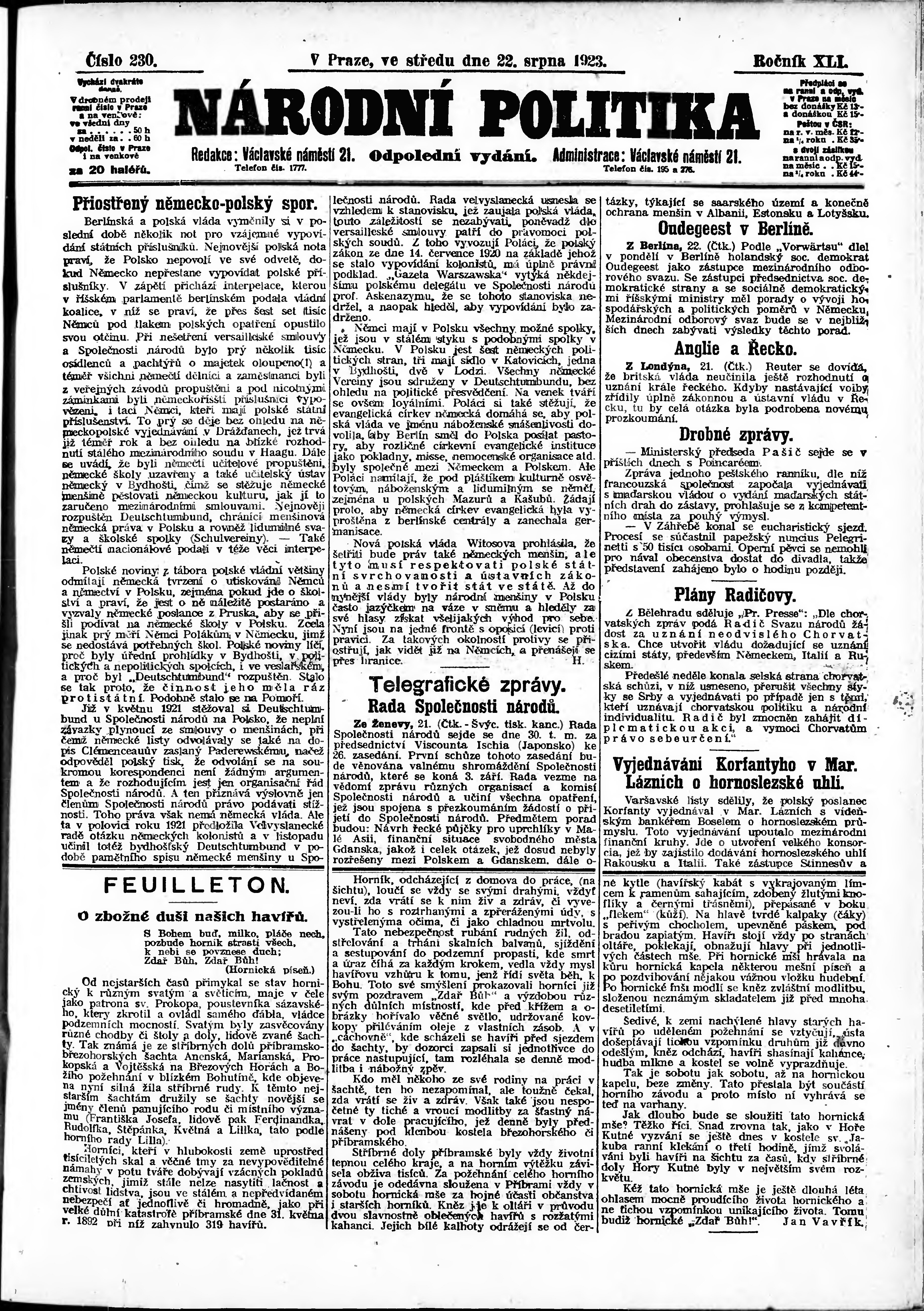 * Datum vydání výtisku: 22.8.1923 Číslo výtisku: 230 Poznámky k výtisku: odpolední vydání;