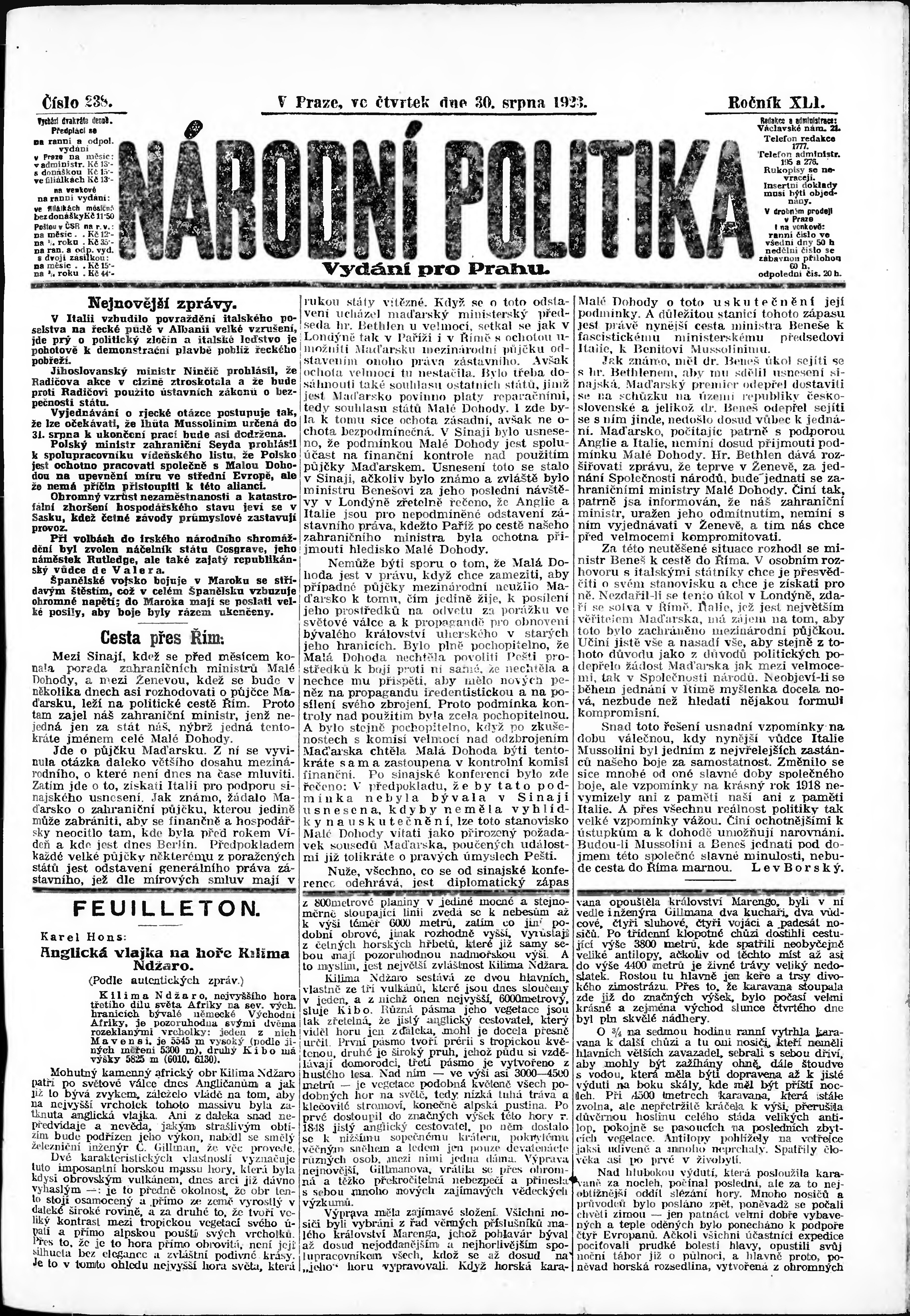 * Datum vydání výtisku: 30.8.1923 Číslo výtisku: 238 Poznámky k výtisku: ranní vydání; vydání pro Prahu;