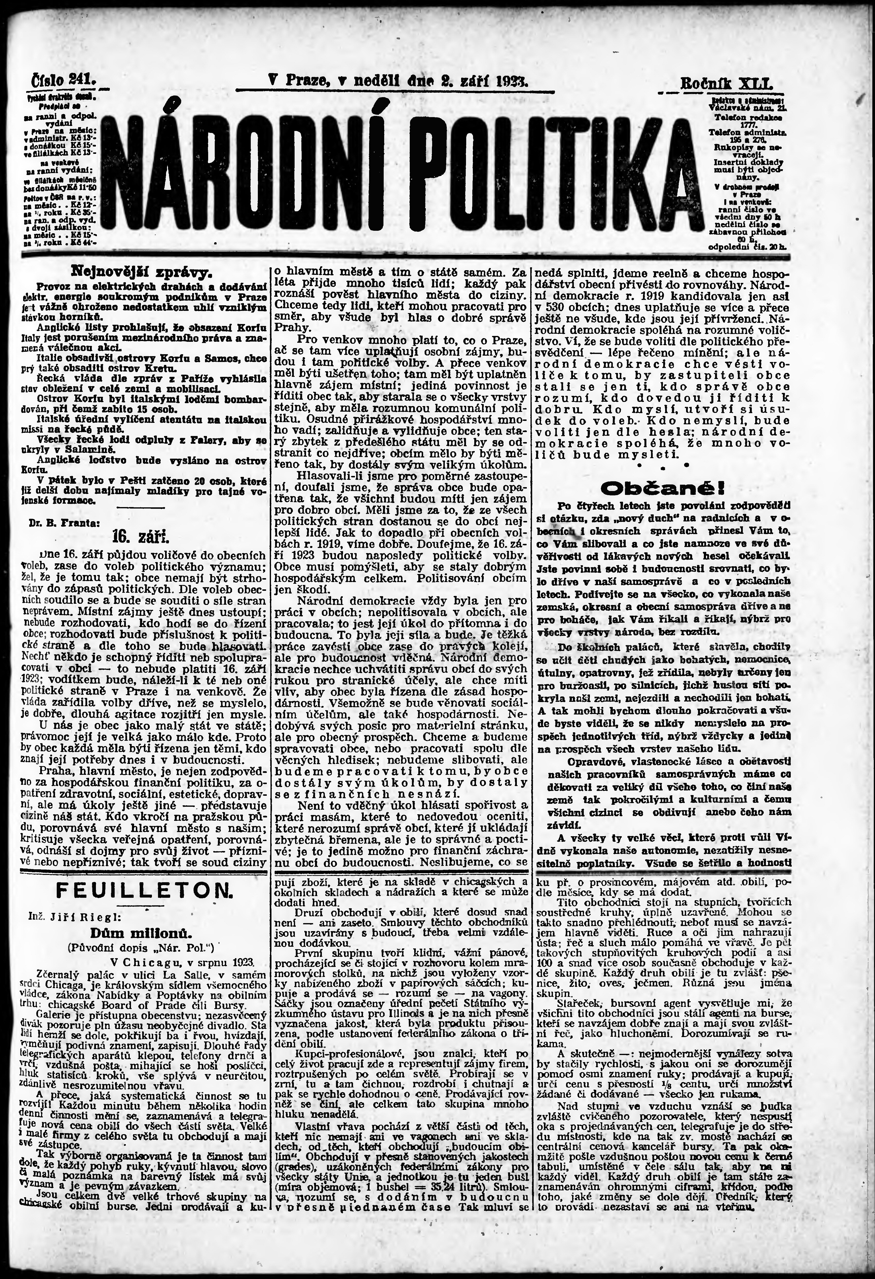 * Datum vydání výtisku: 2.9.1923 Číslo výtisku: 241 Poznámky k výtisku: ranní vydání;